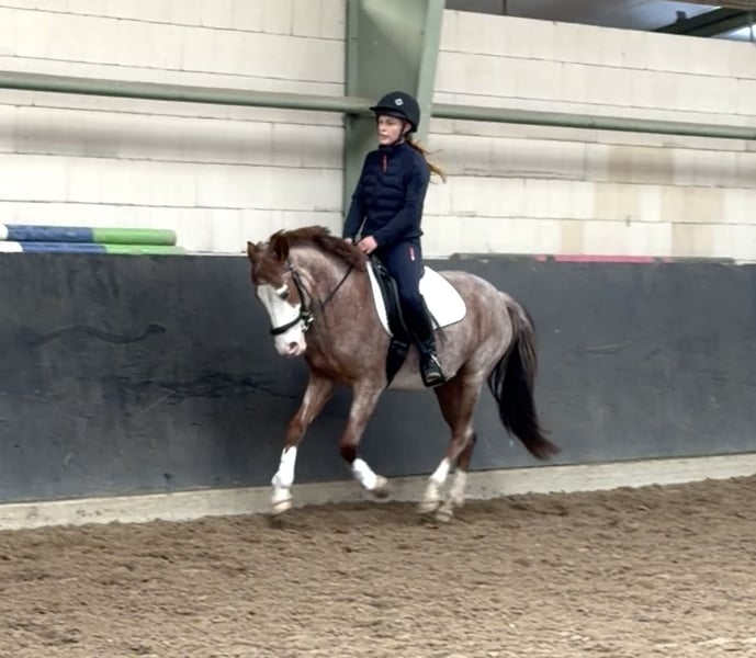 Wunderschönes Sportpony in seltener Farbe Red Roan mit blauen Augen! Zum Verkauf steht eine außergewöhnlich typvolle Sportponystute in der seltenen Farbe Red Roan mit wunderschöner Blesse, vier weißen Beinen und auffällig blauen Augen. Ein absoluter Blickfang mit Sportqualität. „Holde Maid“ ist 6-jährig, mit 1,41 m eingemessen und wurde schonend sowie altersgerecht ausgebildet und startet nun in ihre erste Turniersaison. Sie überzeugt durch ihre sehr guten Grundgangarten, ihre erkennbare Springveranlagung sowie ihre angenehme Rittigkeit. Sie zeigt sich sowohl im Springen, in der Dressurarbeit, im Gelände sowie auf fremden Plätzen stets nervenstark und unkompliziert. Dadurch ist sie sowohl für ein Kind oder ambitionierten Nachwuchsreiter als auch für einen kleineren Erwachsenen interessant. ✔ schmiedefromm ✔ verladefromm ✔ herdenverträglich ✔ klar im Kopf und leistungsbereit Ein vielseitiges Nachwuchspony mit Qualität, das nun den passenden Reiter sucht.