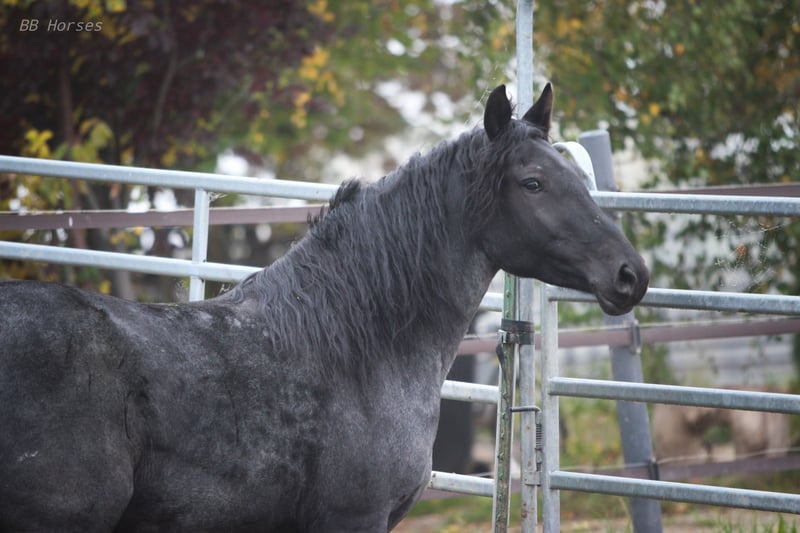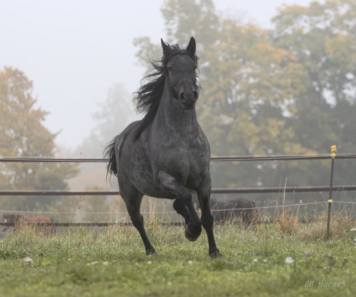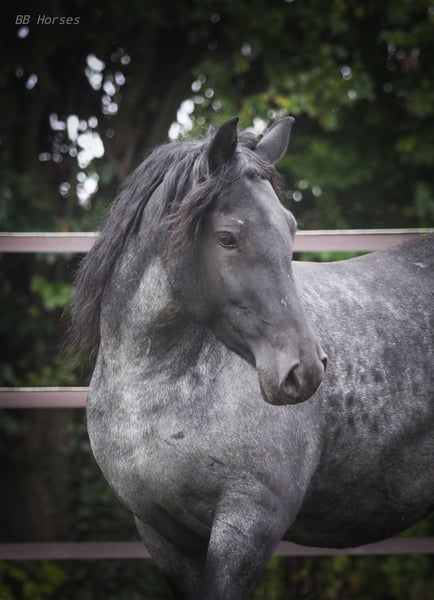 The beautiful blue roan mare Moonlight is looking for her future home. She is 5 years old, ridden, and has also been driven in a carriage. She stands approximately 148 cm at the withers, has a broad build, and is well-suited for adult riders. Moonlight is traffic-safe and confidently walks over roots and stones in all three gaits across terrain, both alone and in a group — no problem for her. She has no issues with rearing, bucking, or bolting. A wonderful and confident mare. If you are searching for a truly stunning leisure horse that will stand by your side through thick and thin, Moonlight would make a fantastic future partner. Breed is unknown/mix. We cannot test drive her with a carriage here as we do not have one, but videos of her driving are available. Moonlight can be visited and tried out at any time. To avoid riding tourism, we charge €25 for a trial ride. We look forward to friendly inquiries. Location: 85669 Further information gladly available at +49 151 43166661