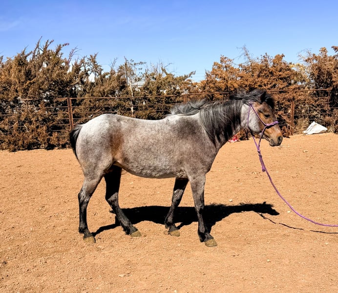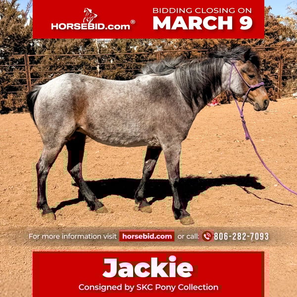 ℳ𝒶𝓇𝒸𝒽 ♦️𝐑𝐈𝐃𝐄𝐑'𝐒 𝐂𝐇𝐎𝐈𝐂𝐄♦️ Happening now thru MONDAY | MARCH 9th - Available EXCLUSIVELY on HorseBid's website! For more details and to register visit: www.Horsebid.com CONSIGNOR CONTACT: SKC Pony Collection 806-282-7093 LOCATION: Canyon, TX BREED: Pony REGISTERED: No COLOR: Bay Roan HEIGHT: 12 hands AGE: 8 GENDER: Mare Jackie is the cutest 12.1 hands bay roan pony mare you have ever laid eyes on. She’s the most perfect size with a sweet kind disposition a willing attitude and so so broke and gentle!! Jackie’s resume is a long one so get ready! She’s been used for all the events at the playdays and Jr rodeos. She will go whatever speed you ask. Our kids have used her to gather, brand and ship cattle, she’s solid and quiet. She’s also been used to carry the flag in the grand entry, ridden in parades downtown, taken on many trail rides to the Palo Duro Canyon and the Canadian River and she’s even been rode English! Jackie is truly a versatile all around pony we just can’t say enough good about her! My absolute favorite thing about Jackie is she NEVER gets fresh. Even when we leave her off for a long period of time, our little ones can still go catch her out of a pasture crawl on bareback and go for a joy ride. She’s happy to go! It’s not un common to see our kids and their friends riding Jackie double after school to the neighbors house, or going to rope the sled, they have even rode her around fireworks and gun fire. Nothing phases her, she’s is a dream pony for any age or level child. Jackie is broke broke too. She neck reins around with ease and trots smooth and has a soft lope. She has a spin that will make dads big horse look bad, stops like she should and side passes both ways. You can open and close gates on her use her to load trucks, pony colts, whatever you need she’s more than capable! Jackie is the kind of pony that adapts to any level of child. from the little beginners to the kids that want to lope through the payday events or go rope a calf with dad Jackie fits the bill! She is truly one of a kind