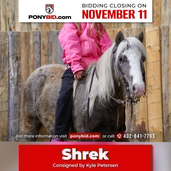 𝓽𝓱𝓮 𝐑𝐈𝐃𝐄𝐑'𝐒 𝓒𝓱𝓸𝓲𝓬𝓮 🐴 𝐏𝐎𝐍𝐘 𝐄𝐃𝐈𝐓𝐈𝐎𝐍 🐴 Happening now thru TUESDAY | NOVEMBER 11th - Available EXCLUSIVELY on Ponybid's website! For more details and to register visit: www.Ponybid.com CONSIGNOR CONTACT: Kyle Petersen 402-841-7763 LOCATION: Corsica SD BREED: Pony REGISTERED: No COLOR: Gray HEIGHT: 36" AGE: 10 GENDER: Gelding Shrek is a super cute 10 year old 36 inch pony gelding. Been ridden by all ages and levels, safe and gentle and cute as they come. Great down the trails and around the farm.