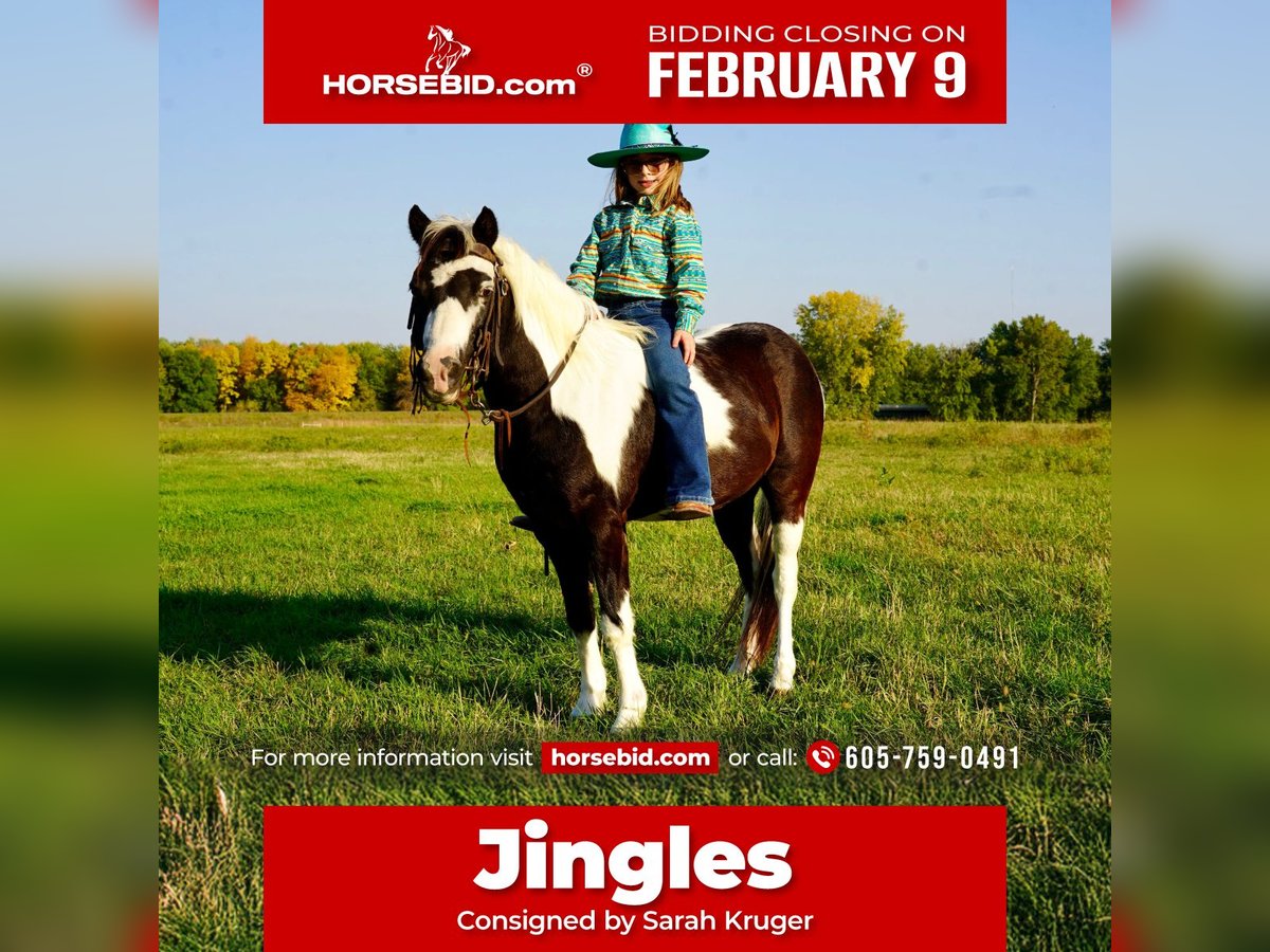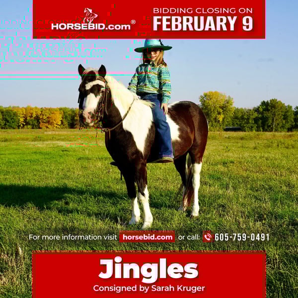 ❤️🔥𝑩𝒆 𝑴𝒊𝒏𝒆 𝐒𝐄𝐋𝐄𝐂𝐓❤️🔥 Happening now thru MONDAY | FEBRUARY 9th - Available EXCLUSIVELY on HorseBid's website! For more details and to register visit: www.Horsebid.com CONSIGNOR CONTACT: Sarah Kruger 605-759-0491 LOCATION: Brandon, SD BREED: Pony REGISTERED: No REGISTERED NAME: Jingles COLOR: Paint HEIGHT: 40 inches AGE: 12 GENDER: Gelding Jingles is the coolest 40 inch 12 year-old paint Pony gelding. He has been part of our family for 3 1/2 years and has given all my nieces and nephews confidence and taught many kids to ride, and about horse care. He is an absolute babysitter that is safe for any age or level of rider from tiny tots to a kid that wants to go a little faster he has been trail rode, taken to rodeo bible horse camp, done pony birthday party’s, helped at church camps for teaching kids to ride, He has been rode millions of hours bareback and rides double, he comes in the house to play toys with the kids. He loads hauls, bathes, trims and shoes good, has been finger painted from top to bottom. he is good with other horses. You can catch him anywhere loves attention loves the kids absolutely no mean bone in his body.