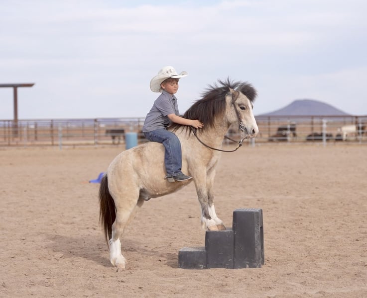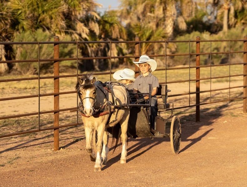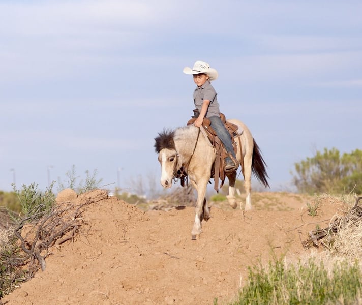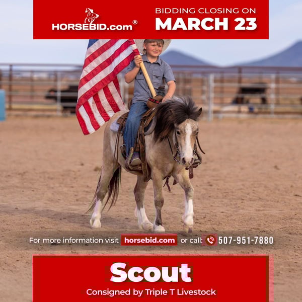 ⚜️𝓽𝓱𝓮 𝐆𝐎𝐋𝐃 𝓢𝓮𝓵𝓮𝓬𝓽⚜️ Happening now thru MONDAY | MARCH 23rd - Available EXCLUSIVELY on HorseBid's website! For more details and to register visit: www.Horsebid.com CONSIGNOR CONTACT: Triple T Livestock 507-951-7880 LOCATION: Aguila, AZ BREED: Pony REGISTERED: No COLOR: Buckskin HEIGHT: 42 inches AGE: 4 GENDER: Gelding Scout – The Kind That Makes Kids Fall in Love with Ponies Scout is a 4-year-old buckskin pony gelding that stands 42 inches tall and is absolutely as cute as they come. With his golden buckskin color, kind eye, and friendly personality, Scout is the type that quickly becomes everyone’s favorite around the barn. He’s the kind of pony that the kids run to the pasture for and the one that’s always happy to see you. Scout is broke to both ride and drive and has been used for just about everything around the ranch. He’s the definition of a versatile little pony — whether the kids want to saddle up and ride, hook him to the cart, or simply lead him around for an afternoon adventure. He has a cute little lope in the arena and is easy for kids to steer and enjoy. Outside is where Scout really shines. He has been trail ridden extensively and is confident traveling out on his own or with other horses. He’s been exposed to dogs, tarps, and the everyday activity of ranch life, and he takes it all in stride. He’s a handy little pony that can go do a job but is still gentle enough for the littlest riders. Scout has also learned a few fun tricks and has the sweetest personality you could ask for. We’ve owned him for the past few years and our kids have had an absolute blast with him. Whether you saddle him up, hop on bareback, hook him to drive, or simply let the kids lead him around, Scout stays kind, patient, and dependable. Ponies like Scout are hard to find — safe, useful, adorable, and genuinely fun to have around. If you’re looking for the kind that will build confidence, create memories, and keep everyone smiling, Scout is the one.