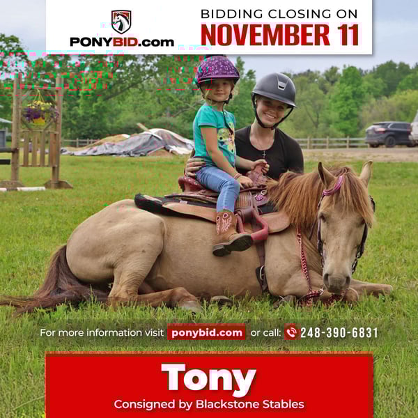 𝓽𝓱𝓮 𝐑𝐈𝐃𝐄𝐑'𝐒 𝓒𝓱𝓸𝓲𝓬𝓮 🐴 𝐏𝐎𝐍𝐘 𝐄𝐃𝐈𝐓𝐈𝐎𝐍 🐴 Happening now thru TUESDAY | NOVEMBER 11th - Available EXCLUSIVELY on Ponybid's website! For more details and to register visit: www.Ponybid.com CONSIGNOR CONTACT: Blackstone Stables 248-390-6831 LOCATION: Howell, MI BREED: Pony REGISTERED: No COLOR: Champagne HEIGHT: 12.1 AGE: 5 GENDER: Gelding Stop your scrolling! Here is the ultimate safe AND talented pony with show experience and trick training! I’m proud to introduce and offer Tony The Pony! He is the pony that kids dream of owning and that parents trust to keep their kiddos safe. Tony is a unique champagne color with a beautiful thick mane and tail. He is 5 years old and stands a stout 12.1hh. Tony is a pony anybody can ride! He walk trot and canters on a loose rein, steers with leg and seat, has flying lead changes, and has excellent breaks. You can ride him in a snaffle bit or no bit at all! Tony has been working in our lesson program teaching all types of riders including the first timers to the more advanced students that jump and show. Tony has attended several schooling shows! He performed well in the chaos and won a few blue ribbons! He most recently competed in a Halloween show and was a part of a costume parade, arguably the cutest minion at the show!! Tony also rides western! He trail rides like an old pro. Nothing phases him out in the woods. He’s seen it all from the hills, creeks, ponds, thick brush, logs, mud, and wildlife. Just when you think Tony couldn’t get any better well he is also trick trained! He knows how to sit and lay down on command. A tap on his left shoulder blade or on his left front pasture and he lays right down to get on or off. Tony has wonderful ground manners. He will ground tie, cross tie, or tie to a post and stand all day to be groomed. He also stands for other things like saddling, farrier, mounting/dismounting, bathing etc. He is also well broke to ride. Hook him up and head to town, a parade or take him sledding in a snowy day, he’s game to do it! He is a finished, safe, quiet, bombproof pony with absolutely no holes in his training! On top of that he has the talent and training to take your young rider to the top of his/her class. What more could you want in a kids pony?!?!? Come meet Tony and he’s sure to steal your heart!