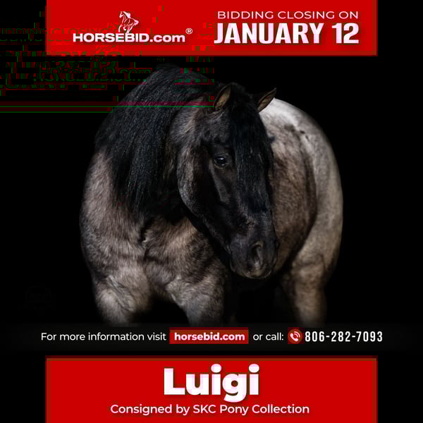 ♦️𝐍𝐄𝐖 𝐘𝐄𝐀𝐑'𝐒 𝑬𝒙𝒕𝒓𝒂𝒗𝒂𝒈𝒂𝒏𝒛𝒂♦️ Happening now thru MONDAY | JANUARY 12th - Available EXCLUSIVELY on HorseBid's website! For more details and to register visit: www.Horsebid.com CONSIGNOR CONTACT: SKC Pony Collection 806-282-7093 LOCATION: Canyon TX BREED: Gypsy pony REGISTERED: No COLOR: Blue roan HEIGHT: 13.1 AGE: 6 GENDER: Gelding Luigi is an adorable 13.1-hand blue roan pony with a kind heart, exceptional mind, and the gentlest disposition imaginable. He is a real deal dream pony! Luigi has been hauled to horse shows play days, junior rodeos, and brandings. He has pushed calves, roped slow calves, packed little kids gathering cattle, carried flags in grand entries, handled gunfire and fireworks, and even stepped out in parades with total confidence. He has also been ridden English, showcasing his versatility. In addition, Luigi is trained to curbside mount and will lay down on cue, making him easy, fun, and accessible for riders of all ages. On the trail, Luigi is safe and steady—unbothered by traffic, wildlife, or new environments. Under saddle, he lopes around smooth and cadenced, stops easily, has slow, correct one-handed spins, and a silky jog with a fun, floaty trot. His transitions are effortless, and there is nothing intimidating about him. Luigi is THE perfect confidence builder—honest, broke, and trustworthy enough to ride with a string around his neck. He is a once-in-a-lifetime pony that offers safety, reliability, and endless memories for a lucky child.