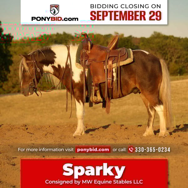 🐴 𝒕𝒉𝒆 𝐅𝐀𝐋𝐋 ℙ𝕆ℕ𝕐 𝑺𝒑𝒆𝒄𝒕𝒂𝒄𝒖𝒍𝒂𝒓🐴 Happening now thru MONDAY | SEPTEMBER 29th - Available EXCLUSIVELY on Ponybid's website! For more details and to register visit: www.Ponybid.com CONSIGNOR CONTACT: MW Equine Stables LLC 330-365-0234 LOCATION: Fresno, OH BREED: Pony REGISTERED: No COLOR: Paint HEIGHT: 39" AGE: 6 GENDER: Gelding Sparky is a flashy six year-old 39” paint pony gelding that is a total sweetheart and an “ in your pocket kind of pony” . Broke to both drive and ride and does all the tricks. If you’re simply looking for a loving, easy to handle companion, Sparky is a perfect fit. Even for beginners. He has been with the same family for over a yr.. He is great on the trails. Whether he’s alone or with others. He has also been introduced to cows. And doesn’t mind at all.