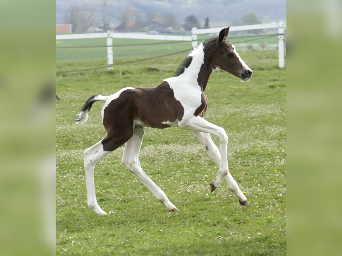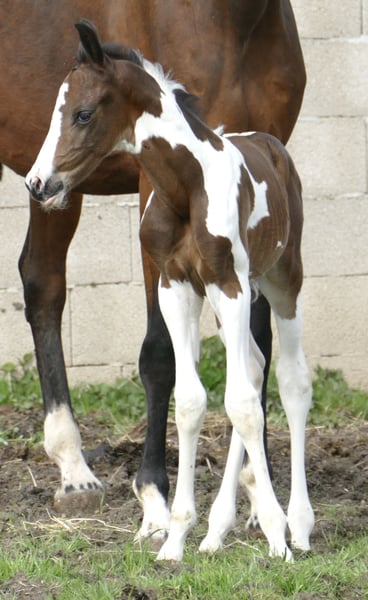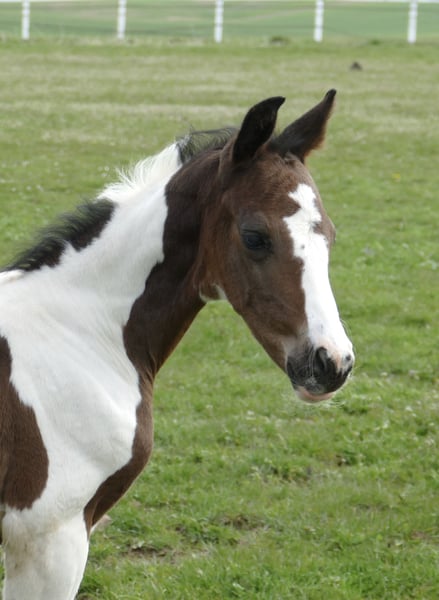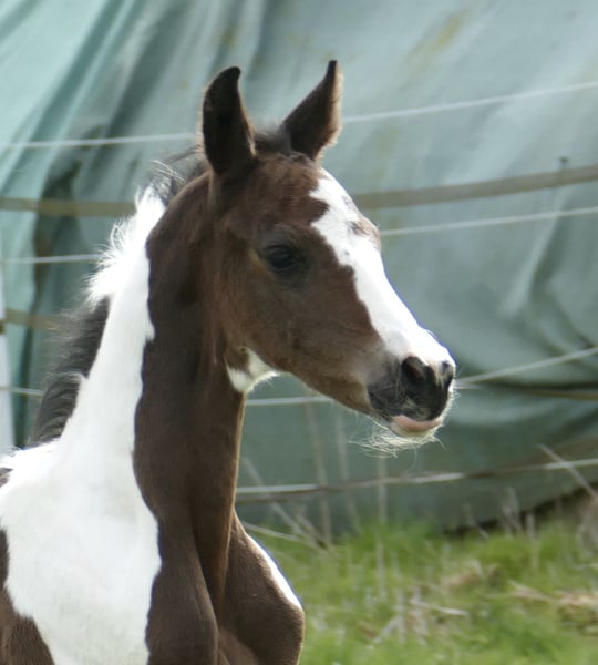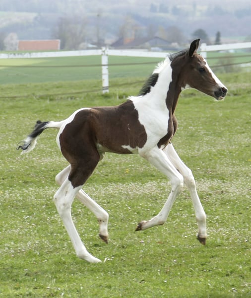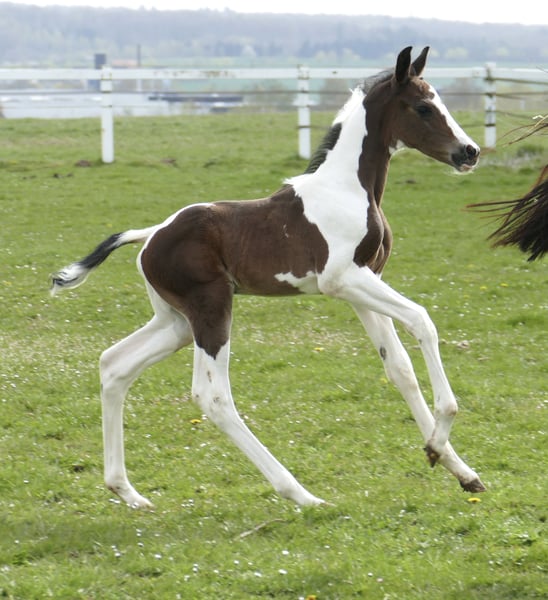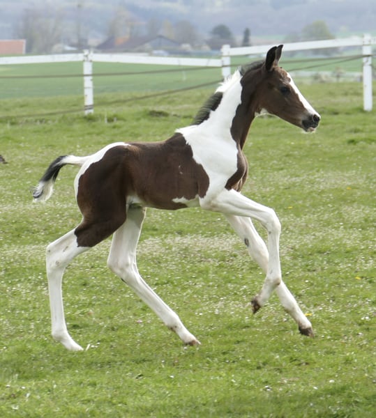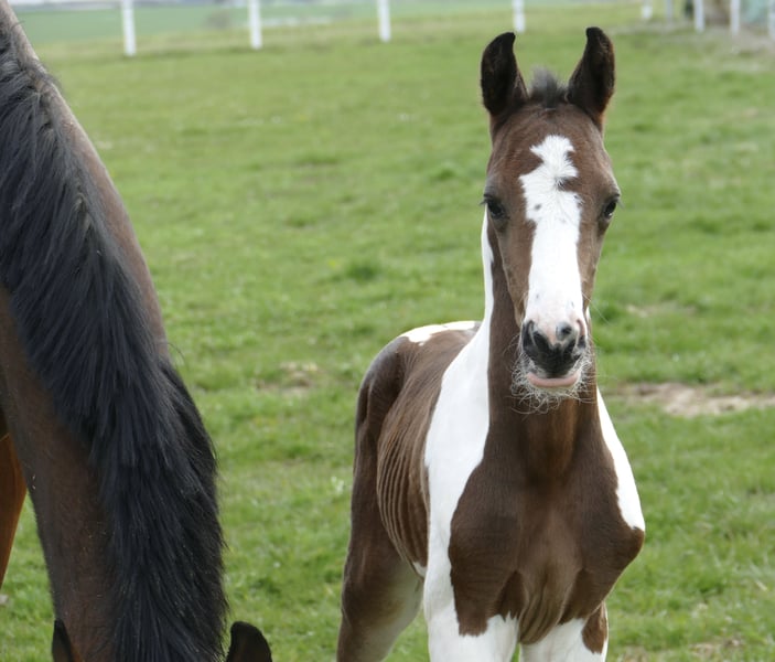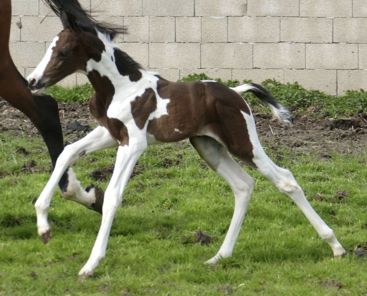 Icy Picasso A A foal that captures attention: Icy Picasso A impresses from the very first moment with its extraordinary appearance and charming personality. This expressive pinto colt combines top-class jumping genetics from Insider x Chaman with a modern type and promising potential. Refined, long-legged, and with an impressive presence, this young talent fully convinces. Notably, his elastic, ground-covering movement potential makes him suitable not only for show jumping but also for dressage or eventing. A foal that captivates – today and certainly in the future on the competition course.