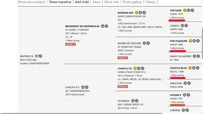 The sire is the champion of France in the high class under the saddle of Edward Levy: https://www.youtube.com/watch?v=a7cWkM6GaoA Beatriche KI's dam has brothers and sisters on the paternal line, who are sold at auctions in Europe for fabulous prices exceeding 200-250K euros: https://www.facebook.com/BulgarianSportHorses/posts/pfbid0gkmyNJ9FYk5rfEfNXK36hcP8cbJFWLjFVCKJerstiyjV4xAX7sSkf9G7hMtfj5zgl
