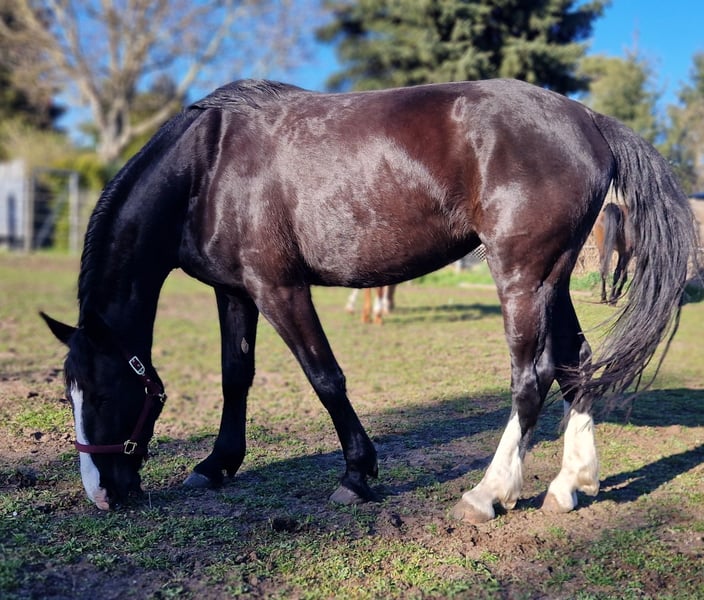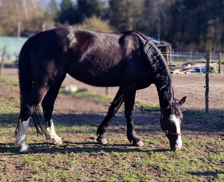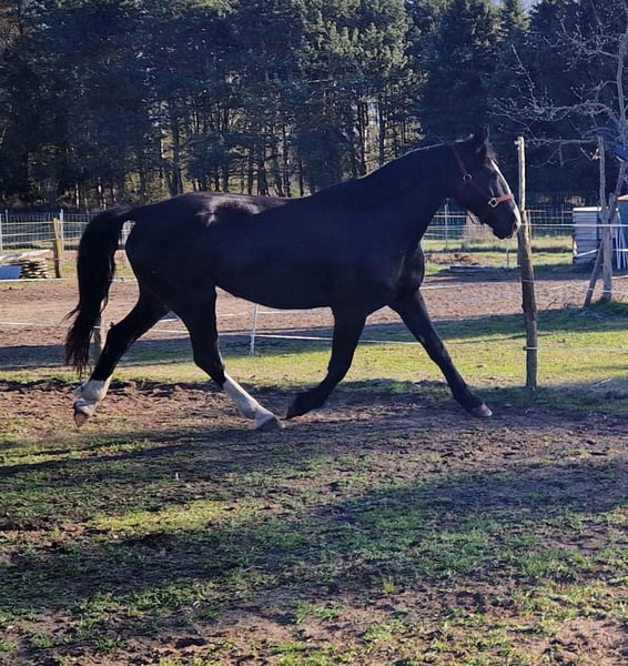 Wunderschöne 5-jährige Rappstute [5/21] mit ausdrucksstarker Bewegung in alle 3 GGA. Absolut unerschrocken und sicher im Gelände sowie im Straßenverkehr. Auch bei der Platzarbeit und am Boden immer fleißig und lernwillig. Herdenverträglich, Verladefromm. Stockmaß zur Zeit 1,71 m.