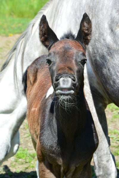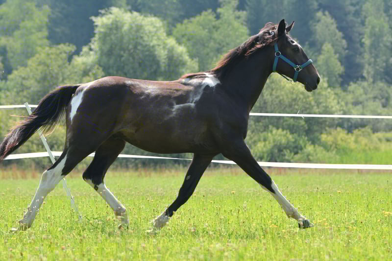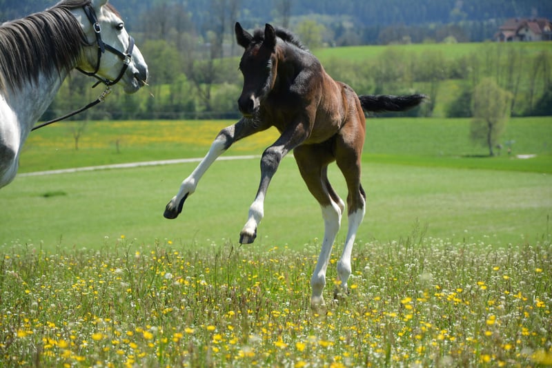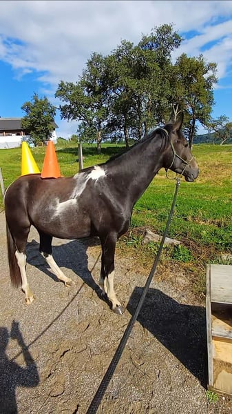 DATA & PEDIGREE: • Warmblood – Arabian – Crossbreed • Mother: Nonius Cross, Father: Partbred Arabian stallion "Norcal Sierra Snoman" • Born: April 27, 2023 • Harmonious conformation, correct foundation, final height approximately 16.0 hh • Very good hooves, easily navigates rocky terrain • Black-brown pinto – will turn grey with age • Calm, loving temperament, very affectionate and people-oriented, also very playful • Has successfully undergone treatment for a Gnat allergy (via ASIT immunotherapy) IT IS WITH A HEAVY HEART THAT I MUST PART WITH MY ADORABLE, LOVING GELDING TARAN. Originally, he was born as a playmate for the foal of my breeding mare, and I initially planned to sell him as a one-year-old. However, his loving nature quickly won me over, and I decided to keep him and continue his training. Now, I find myself at a point where I realize I lack the time to give him the attention and development he deserves. Therefore, I am looking for someone who can provide him with exactly that. Taran wants to please his human and works with great joy and motivation. Despite his young age, he already knows quite a lot: - **Trail riding:** I regularly took him out on walks and as a lead horse in all three gaits, always well-behaved and reliable, whether alone or in company. Even without herd contact, he remains calm and composed. - **Desensitization training:** Through targeted exercises, he remains relaxed around umbrellas, tarps, spray bottles, etc. He shows no fear when saddling or wearing cooling blankets. - **Groundwork:** I have worked with him on leading, forehand and hindquarter turns, sending away, loading, and some Parelli games. - **Lunging:** He is easily lunged, understands walk, trot, and side-passing. - **Transport:** He enters the trailer fearlessly and calmly. Additionally, Taran impresses with his beautiful appearance. As a black-brown pinto, he will gradually turn grey as he ages, being a mixed-color grey. With a final height of about 16.0 hh and his harmonious build, he is truly eye-catching. I place great importance on healthy, well-balanced hooves and have been trimming his hooves every four weeks from the start. To prevent errors, a professional checks his hooves every few months. Thanks to regular trimming, he has very strong, healthy hooves and moves easily over rocky ground. He is very well-behaved during trimming, as he has been accustomed to it since his first month of life. At six months old, he developed an allergy to gnats, which has been successfully treated with ASIT immunotherapy. Since then, he has been almost symptom-free and shows almost no itching at his mane and tail anymore. Otherwise, he has no health issues. I am happy to provide more details about his treatment in a personal conversation. He currently lives in a harmonious herd in an open stable with 11 other horses, fitting in very well. He is somewhat lower in rank and quite playful. If you are looking for a loyal lifelong partner—a horse that impresses with its cheerful, eager-to-learn, and heartfelt nature and can be shaped according to your own ideas—Taran will be your ideal companion. Additional photos, videos, and information, as well as viewing appointments, are available upon request at 0650 3904002.