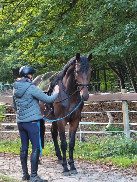 Eddy is a lovable leisure partner who already captivates with his friendly and sweet nature at the grooming area. He is also well-behaved and incredibly cool under saddle. Eddy is easy to rein and has appealing movement, showing joy and talent in jumping. He is pleasant to ride in dressage, completes small jumps with his rider, and is absolutely willing and fearless in the field, whether alone or in a group. With further training, he could also be suitable for competition sport. He is so relaxed that he even allows himself to be mounted from the ground. He will surely enjoy ground work and small tricks. Curious and a bit playful, Eddy is a real sweetheart. During the day, Eddy shares a paddock with other geldings and stays in a box at night. He is also familiar with pasture turnout and open stall housing. In handling, he is a treasure. Bathing, farrier visits, loading, all no problem. A great opportunity for someone who wants to continue shaping their future dream horse. Almost 4 years old, Hanoverian gelding, 16.1 hh Clinical health check available Video: https://youtu.be/qH6W38tlBkA?si=8w2eZvt6WqLIQqtG "Videos, training clips, and further impressions of our sale horses can also be found on Instagram: [maresi_lange]. There you will find additional information and insights into the development of the horses." More horses are available on my homepage MaresiLange.de or upon request. The description of the horse is based on subjective impressions and experiences of ours and is not a guarantee of properties or characteristics. Trial riding is at your own risk. The sale is conducted on behalf of the owner. For viewing or trial riding, we reserve the right to charge a fee of €30, which will be deducted from the purchase price if the horse is bought.