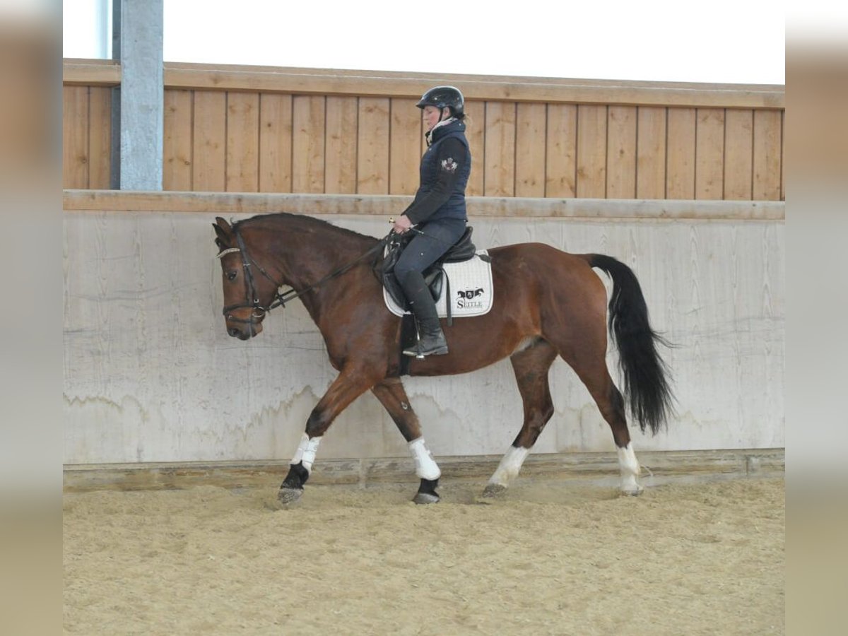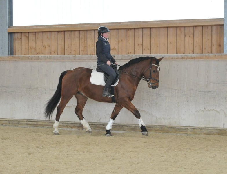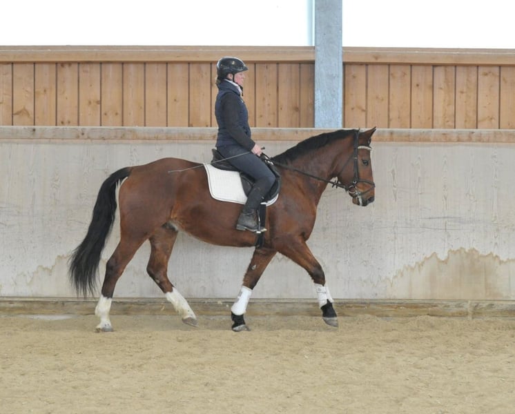 Dieser hübsche 5-jährige Wallach vom bekannten Vererber Acorado, Vater Aromats, überzeugt mit drei guten GGA und sehr viel Talent am Sprung sowie toller Einstellung. Äußerst bequem zu sitzen vermittelt er ein wunderbares Reitgefühl. Er kennt das Training auf den Äußenplätzen sowie in der Halle. Dressurmäßig auf dem Weg zu E und A-Niveau eignet er sich auch für unerfahrene Reiter. Durch seine Größe auch für Damen und Junioren geeignet. Auch für Geländeausritte ist er immer zu haben.