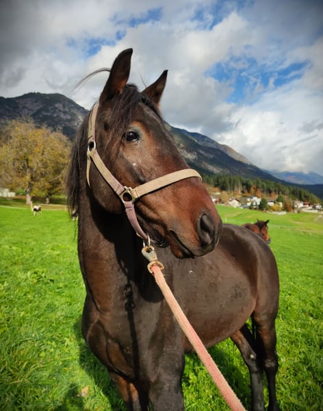 "Primus" est un hongre Pinto de 6 ans, de robe unie. Il est très câlin, suit chaque personne comme un chien de grande taille et adore recevoir des caresses et des gratouilles. Selon son âge, il est encore joueur, mais dans le groupe il occupe plutôt une position basse dans la hiérarchie. Il connaît aussi bien le box que le pâturage en liberté. Malheureusement, il présente un handicap : une pièce osseuse a été détectée dans son articulation du talon gauche (radiographies disponibles). Celle-ci pourrait être retirée chirurgicalement, et après l’opération, il n’y aurait aucune objection à le faire monter en selle. Cependant, comme il est difficile de prévoir comment la charge du cavalier pourrait influencer son état avec cette pièce, il est actuellement uniquement proposé comme cheval de compagnie. Primus a toujours été et est toujours indemne de toute douleur ! Il est halter-trainé et peut donner les pieds, mais en raison de la blessure, il n’a pas été davantage entraîné. Nous souhaitons pour lui une personne qui puisse le travailler au sol, faire de longues balades ou simplement l’aimer. Transport possible. Prix à discuter.