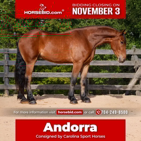 ⚜️𝐓𝐇𝐄 𝐅𝐀𝐋𝐋 𝐇𝐄𝐑𝐈𝐓𝐀𝐆𝐄 𝐂𝐋𝐀𝐒𝐒𝐈𝐂⚜️ Happening now thru MONDAY | NOVEMBER 3rd - Available EXCLUSIVELY on HorseBid's website! For more details and to register visit: www.Horsebid.com CONSIGNOR CONTACT: Carolina Sport Horses 704.249.8500 LOCATION: Clover SC BREED: WarmBlood Draft X REGISTERED: No COLOR: Bay HEIGHT: 17.1 AGE: 5 GENDER: Gelding 🐴 Andorra — 17.1h Warmblood Draft Cross Gelding (5 Years Old) Offered by Carolina Sport Horses, Clover, SC Meet Andorra, the total package for riders who want size, style, and safety wrapped into one stunning athlete. Standing a statuesque 17.1 hands, this Warmblood Draft cross brings together the best of both worlds — the bone and brain of a draft with the movement and scope of a sport horse. Andorra is as honest as they come under saddle — forward and responsive, yet never hot or spooky. Whether he’s galloping in the hunt field, tackling a cross-country course, or cruising down the trail, he stays steady, confident, and reliable. He’s well-schooled in the foundations of three-day eventing, showing natural rhythm, balance, and jump technique that make him a joy to ride and a pleasure to watch. With beautiful uphill movement, expressive gaits, and an easy-to-sit canter, Andorra turns heads everywhere he goes. His temperament is second to none — the kind you trust to take care of you in new places, new fences, and new adventures. ✅ Fox Hunts ✅ Three-Day Eventing ✅ Trail Riding Superstar ✅ Amateur & Lady Friendly If you’re looking for a handsome, talented, and trustworthy partner that can go from the show ring to the hunt field with style and safety — Andorra is your horse. 📍Located in Clover, South Carolina 📞 Call or Text 704-249-8500