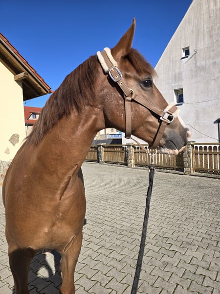 Schön gezeichneter, kleiner Warmblutpferd zum Verkauf. Ca. 155 cm Stockmaß, edler Typ. Mutter: Iskierka Wlkp nach Faust OO Vater: Kaleń Śl. nach Lombard Śl. Geboren 2019. Ich habe ihn gekauft, als er 1,5 Jahre alt war, und seitdem ist er in meiner Obhut. Sein Ausbildungsstand ist als vorerst eingeritten mit Problemen, die noch bearbeitet werden müssen. Er wurde von Anfang an auf die Grundausbildung trainiert. Mit drei Jahren begann die Arbeit mit Sattel und Longe, er nahm den Reiter mit stoischer Ruhe auf, es gab keine Probleme beim ersten Aufsteigen und Reiten. Seit einiger Zeit zeigt er jedoch Schwierigkeiten mit dem Reiter auf dem Rücken, als hätte er Angst davor. Er ist sehr sensibel und freundlich, ruhig bei Pflege und Hufschmied, mag Wasser und Sprühflaschen nicht, aber bei systematischer Arbeit gewöhnt er sich schnell daran. Von seinen Vorfahren hat er die besten Eigenschaften geerbt: kräftige, harmonische Konstitution, gerade, gesunde Beine, starke Hufe, widerstandsfähig gegenüber Witterungseinflüssen, nicht dicker, keine Krankheiten, nie verletzt. Er nutzt jede Futterration sehr gut (was sich in Übergewicht zeigt). Er wird von morgens bis abends in der Herde auf der Weide gehalten, im Sommer auch nachts. Im Herdenverband ist er nicht dominant, lässt sich aber nicht alles gefallen. Geimpft, entwurmt und regelmäßig entwurfsystematisch behandelt. Der Pferd frisst nur nach der Mahlzeit, eine Gastroskopie wurde nicht durchgeführt. Er zeigt keine Schmerzen oder Anzeichen von Magengeschwüren. Es könnte eine Gewohnheit nach dem Fressen sein, da er als 2,5-jähriger Hengst während der Abwesenheit der Stallbesitzerin in einer Box gehalten werden musste. Niederschlesien, Jelenia Góra