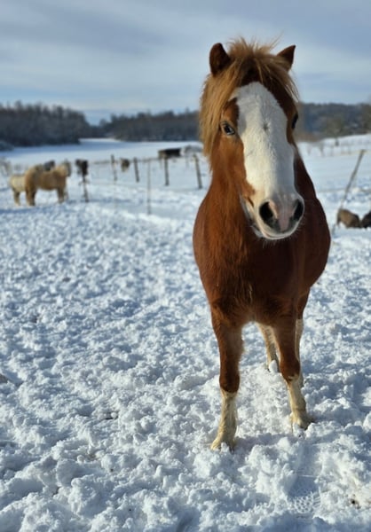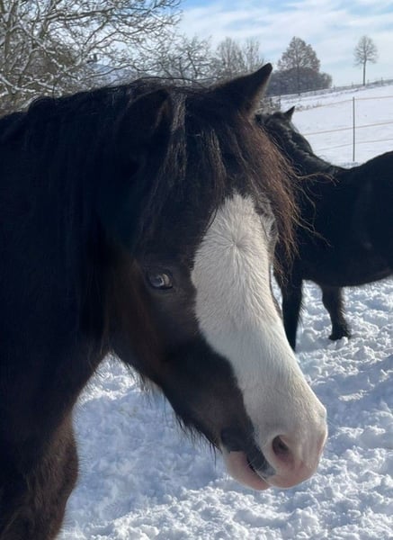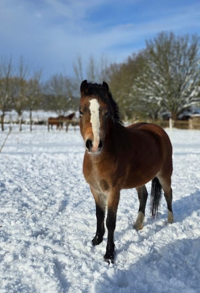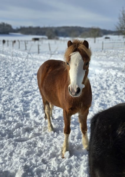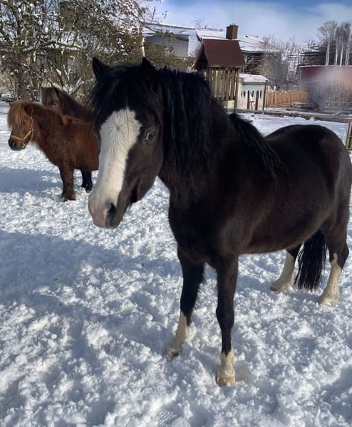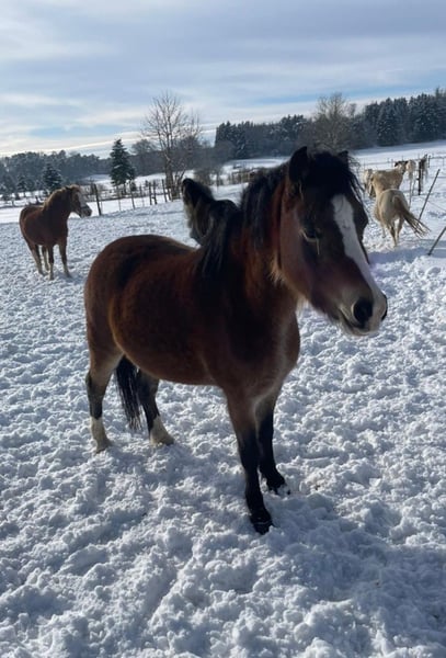 These three adorable pony mares, Blacky, Füchsle, and Brownie, are looking for a loving home through this platform. All three are very affectionate but can be a bit cautious around strangers at first. We are only now beginning their training, as they developed quite late. They are small but refined, with good conformation. We are only placing them in the most caring hands. Blacky has a blue and a brown eye, Füchsle has a beautiful markings, and Brownie is simply Brownie. They are vaccinated and microchipped. More information is gladly provided in person. The price refers to one pony. In commission.
