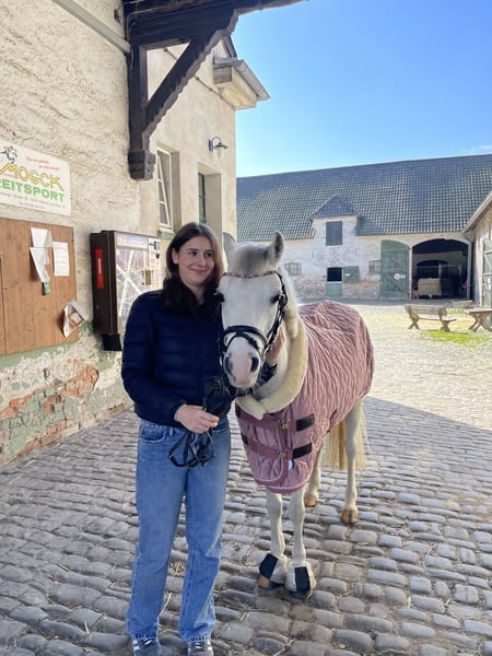 Elina ist eine außergewöhnlich hübsche Stute mit holländischer Abstammung mit siegreichen Eltern und eigenen Siegen im Zucht-Verband. Elina ist eine liebenswerte, hübsche Stute, die sich auch für kleinere Turnierauftritte eignet. Sie ist schon Reiterwettbewerb, E Dressur gegangen und wurde von Kindern freizeitmässig gesprungen. Für Elina stellen wir uns eine liebe und kümmernde Familie vor, wo sie exklusiv gepflegt und geliebt und geritten wird und einen lebenslangen Platz erhält. Führzügelwettbewerbe hat sie mit Bravour gemeistert und ein wunderschönes Bild abgegeben. Elina hatte vor 2-3 Jahren aufgrund ihrer Feinfühligkeit von den Hufen eine Rehe, welche mit dem richtigen Beschlag nicht mehr aufgetaucht ist. Elina läuft seit zwei Jahren ohne Einschränkungen im Unterricht mit und hat daher bewiesen, dass sie ein zuverlässiges, reitbares und gesundes Pony ist: