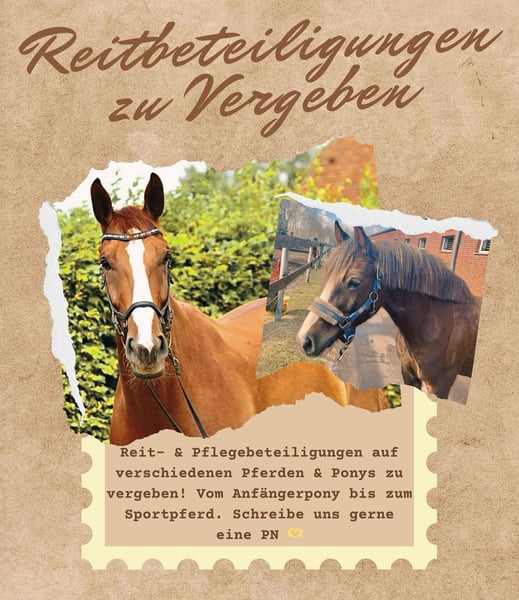 Vom Anfängerpony bis zum gehobeneren Sportpferd mit Turniererfolgen - wir haben verschiedene Reitbeteiligungen zu vergeben! Auch Pflegebeteiligungen sind möglich. Für die Reit- und Pflegebeteiligungen fallen keine Kosten an, lediglich der Reitunterricht muss bezahlt werden (kostet bei uns am Verein 60€ im Monat für 4 Std à 3 Reiter). Vereinsmitgliedschaft ist ebenfalls verpflichtend (25€ für Kinder, 40€ für Erwachsene 1x im Jahr). Hochwertige Ausrüstung wird zur freien Verfügung gestellt!