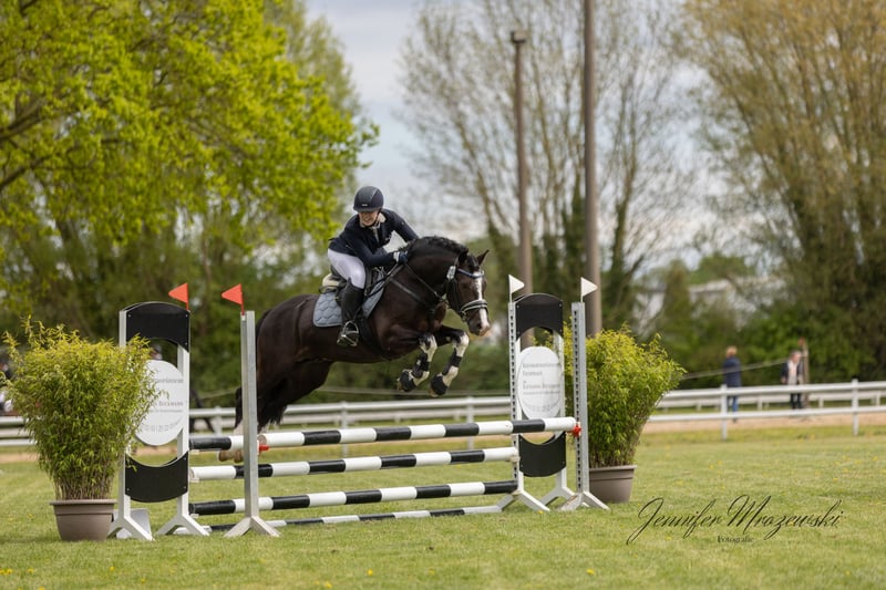 Mühlenbeeks Bandit to 8-letni, licencjonowany ogier Welsh Cob (sekcja D) o wzroście 1,44 m. Łączy sportowy potencjał, chęć do pracy oraz wyjątkowy charakter. Czy jest coś, czego Bandit nie potrafi? Wyraźnie nie! Niezależnie od dyscypliny – od ujeżdżenia, przez skoki, teren czy hodowlę – Bandit szybko się uczy, jest zawsze chętny do nowych wyzwań i pragnie przypodobać się swojemu człowiekowi. Bandit zachwyca nie tylko wyglądem, ale także wspaniałym, absolutnie nie-hengstowym charakterem, świetnym nastawieniem do pracy oraz klarownymi, wygodnymi chodem. (Dobrze radzi sobie również z dziećmi zarówno w ręku, jak i pod siodłem!) W skokach prezentuje potężny, pewny skok, jest odważny i zawsze chce dotrzeć na drugą stronę – nie robi na nim wrażenia podłoże ani przeszkody wodne. Na trasie terenowej również okazuje się odważny i niezawodny, nie przeszkadzają mu przekraczane rowy czy brody. Samodzielnie czy w grupie, na spacerze, kąpieli, bez siodła, jedynie na halterze i lonży – wszystko to nie stanowi dla niego problemu. Bandit nocuje w boksie, a w ciągu dnia jest sam na swoim paddocku. Nie przeszkadzają mu w sąsiedztwie inne ogiery, wałachy ani klacze, zarówno w boksie, jak i na pastwisku. Jest również chętny do załadunku, do czyszczenia podkuwek, regularnie odrobaczany i szczepiony. (Osiągnięcia hodowlane): • Licencja uzyskana 08.02.2020 w Neumünster • Ukończenie 30-dniowego testu stajennego (kierunek hodowlany – ujeżdżenie) w terminie od 08.08. do 09.09.2021 • 5. miejsce w klasyfikacji ogólnej, 2. miejsce w kategorii Welsh Pony na Narodowej Wystawie Ogierów FN dla koni sportowych w Berlinie, 20.01.2023 W swojej pierwszej sezonie startowym odniósł sukcesy w ujeżdżeniu do poziomu klasy L oraz w skokach do poziomu klasy A. Zdobył także brąz w powiatowych mistrzostwach Ostholstein w ujeżdżeniu (LK5) i wszechstronności (LK6). W skokach ma potencjał przekraczający poziom A, a lekcje powyżej klasy L są nadal rozwijane. Bandit pewnie pokonał swoje pierwsze terenowe próby i zajął pierwszą rezerwę. Cena może ulec zmianie w miarę dalszej edukacji i osiągnięć. Dla nas najważniejsze jest, aby Bandit nie tylko rozwijał się sportowo, ale także był kochany w nowym domu i stał się Twoim najlepszym przyjacielem. Bandit sprzedawany jest na zlecenie. Wciąż jest własnością jego hodowcy i został mi powierzony do szkolenia. W przypadku poważnego zainteresowania prosimy o kontakt – chętnie wyślemy filmy i dodatkowe informacje na życzenie.