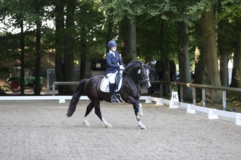Möhlenbeeks Bandit is an 8-year-old approved Welsh Cob (Section D) stallion standing at 14.4 hh. He combines sporting potential, willingness to perform, and an exceptional character. Is there anything Bandit cannot do? Clearly not. Whether dressage, jumping, cross-country, or breeding – Bandit learns quickly, is always eager for new challenges, and strives to please his handler. Bandit impresses not only with his appearance but also with his wonderful, completely non-stallion-like temperament, a great work ethic, and clear, comfortable gaits. (He is also easy to handle and ride for children!) In jumping, he shows a powerful scope, is brave, and always wants to get to the other side – he is unimpressed by fillers and water ditches. He also demonstrates courage and reliability on cross-country, confidently galloping over built-up ditches and through water. Solo or in a group, hacking, bathing, riding bareback with just a halter and lead rope – all pose no problem for him. Bandit is stabled overnight and spends his days alone in his paddock. He is not bothered by other stallions, geldings, or mares, whether in the box or on the paddock. Additionally, he is loading and farrier-friendly, regularly wormed, and vaccinated. (Breeding) achievements: • Approved on 08.02.2020 in Neumünster • Completed the 30-day performance test (dressage focus) from August 8 to September 9, 2021 • Overall 5th place, 2nd place among Welsh ponies at the FN Federal Stallion Show for Sport Ponies in Berlin on January 20, 2023 In his first competition season, he achieved placings up to L level in dressage and successes up to A level in jumping. We also earned bronze in the district championships for Ostholstein in class 5 dressage and class 6 eventing. His potential in jumping extends beyond A level, and his lessons over L level are further solidified. Bandit confidently mastered his first cross-country course and was the first reserve. Price may increase with further training and achievements. It is very important to us that Bandit is not only supported and challenged in his sport but also loved in his new home and becomes your new best friend. Bandit is sold on behalf of his owner. He is still owned by his breeder and has been entrusted to me for his training. For serious inquiries, we look forward to your message or call – videos and further information are available upon request.
