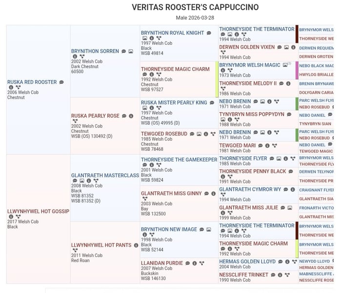 Veritas Rooster’s Cappuccino bei uns Gino genannt 28.03.2026 Llwynhywel Hot Gossip 1,52 × Ruska Red Rooster 1,50 MV: GLANTRAETH Masterclass Zum Verkauf steht ein typvolles, gesundes Welsh Cob Fohlen mit guter Abstammung. Es überzeugt durch sein kräftiges Erscheinungsbild, freundlichen Charakter und seine neugierige, ausgeglichene Art. Das Fohlen wächst artgerecht in der Herde auf, ist gut sozialisiert und kennt den täglichen Umgang mit Menschen. Es zeigt bereits schöne, schwungvolle Bewegungen – ideal für Freizeit, Sport oder Zucht. Bis zur Abgabe wird regelmäßig entwurmt und das Fohlen ABC geübt. Kann zur weiteren Aufzucht bei uns bleiben. Bei Kaufzusage ist eine Anzahlung zu leisten, der Restbetrag ist spätestens zum Absetzen fällig. Bei Interesse freuen wir uns über Ihre Nachricht!