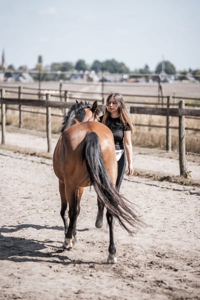 Dit is Estella, een 5-jarige D-pony van 146 cm (officieel gemeten). Ze is een duidelijk Welsh-type, maar omdat haar ouders in het paspoort onbekend zijn, heeft ze geen officiële Welsh-papieren. Ik kocht haar in juni met het plan om haar rustig op te leiden en daarna te verkopen. Alleen merkte ik al snel dat het trainen van meerdere paarden per dag mij niet gelukkig maakt, waardoor ik voor haar simpelweg te weinig tijd maak. Daarom staat ze nu te koop. - Keuring Ze is in juni klinisch gekeurd en goed bevonden. Een herkeuring mag altijd op kosten van de koper. - Training op dit moment Estella is nog onbeleerd, maar dit kent ze wel: * Longeren * Dubbele lange lijnen * Een barebackpad op haar rug * Ik heb er een paar keer in stilstand op gezeten Staat ze hier langer, dan pak ik haar training verder op en gaat de prijs mee omhoog. - Karakter Estella is een pony die je echt leert waarderen als je van gevoelige paarden houdt. Ze is: * Gevoelig, introvert en eerlijk * Denkt graag met je mee en wil het goed doen * Sociaal in de kudde * Maar heeft in haar leven nog niet veel van de wereld gezien * Heeft rust en vertrouwen nodig, maar geeft je daar ontzettend veel voor terug Met de juiste rustige aanpak is ze een pony die enorm veel voor iemand kan betekenen. Ik vind de trainingen met haar altijd heel fijn; ze pakt dingen slim op en denkt graag met je mee. Haar gevoeligheid maakt haar juist zó fijn om mee te werken, omdat je klein en licht kan zijn in je hulpen. Ik weet zeker dat ze voor iemand een ongelooflijk waardevolle pony gaat worden. - Voor wie is ze geschikt? Voor iemand die: * Het leuk vindt zelf een jong paard te begeleiden * Rust, duidelijkheid en vertrouwen kan bieden * Een gevoelige pony zoekt met heel veel potentie! Interesse? Stuur gerust een berichtje als je vragen hebt of Estella wilt komen ontmoeten.