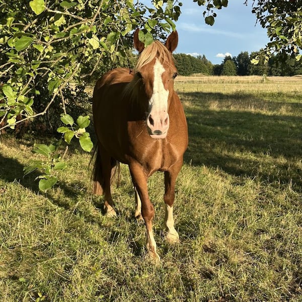 Missy / Clanroy Heulwen is an exceptionally beautiful Welsh Cob D pony. - Height: 148 cm - 8 years old, born in 2018 - Barefoot - Has been living in a paddock for two years but is also familiar with box stalls. Missy is clear-headed, always motivated with good forward drive, and very empathetic, friendly towards people, and loves to cuddle. Visually, she is perfectly built with a striking blaze. She is being sold because, unfortunately, we do not have the time and experience to train and promote her according to her age. She knows the gaits, moves sideways, backwards, can be ridden and lunged, is well-behaved during hoof cleaning and grooming. However, she needs a sensitive person with a lot of experience, as she sometimes tests her limits. Missy quickly understands what is expected of her and always tries to comply. She is unfamiliar with the use of a whip or spurs, and they are not needed at all. She is very eager to move, and you definitely won't have to struggle with her! Missy is suitable for: - Dressage (has been ridden English so far) - Western (due to her broad back and agility) - As a breeding mare Not suitable for: - As a children's pony - As a show jumper She is in excellent health. We have had her regularly vaccinated, dewormed, and her hooves have always been professionally cared for. In the 2 years she has been in my possession, she has never been sick or lame! She comes with some equipment: bridle, side reins/lunge, grooming tools but without a saddle.