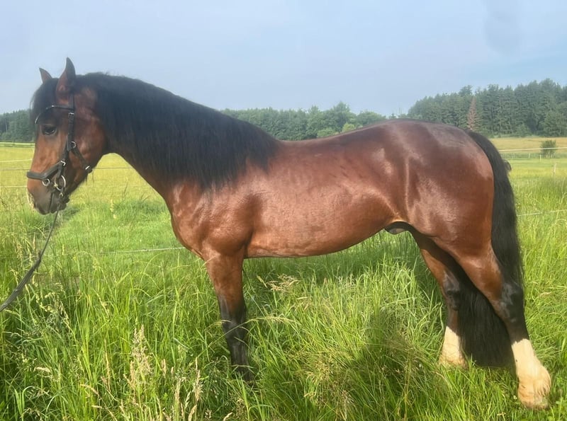 He is four years old, Castrated for four weeks. He has been backed and driven in single and double harness. Current height at the withers is 145 cm, but he will grow a few more centimeters. He has also been ridden in the terrain. He has covered and may not be able to be kept in a group, as he is still stallion-like.