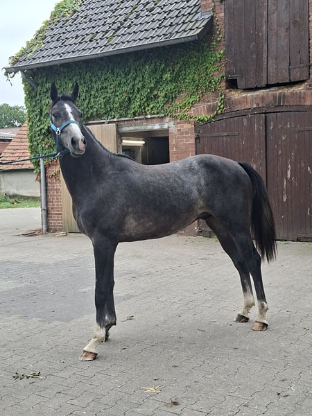 We are selling a approximately 1.63m tall 2.5-year-old young stallion with a lot of potential to become a good show jumper. He is currently living in a herd of young stallions with 6 other young stallions and has grown up here. He is well-behaved on the ground and can be haltered in the pasture and led out easily. You can tie him up and groom him without any problems. Additionally, he loads well. He has been regularly seen by the farrier and always receives good feed, as well as mineral supplements. If you are interested, please feel free to contact us at 015117670724. Best regards, Rita Bruns