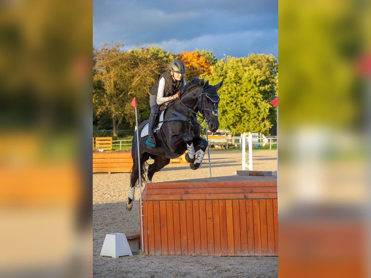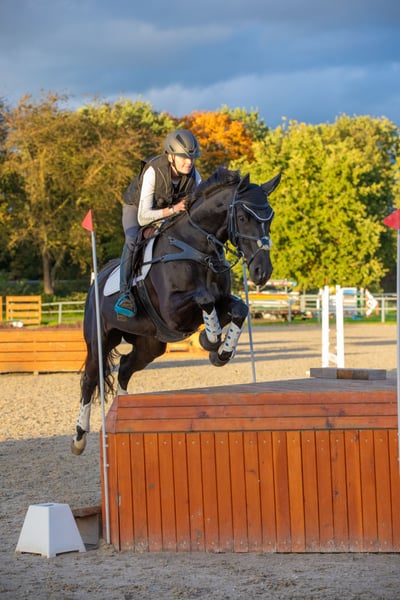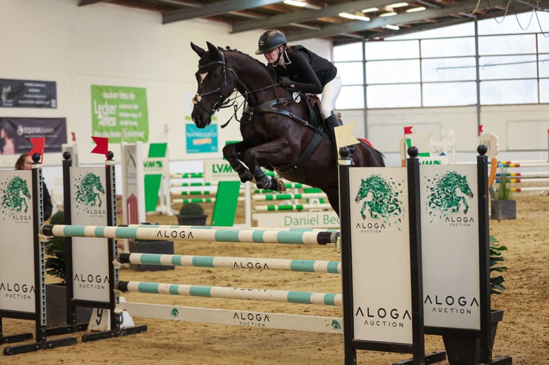 Zum Verkauf steht eine 12 jährige Headshakerstute. Sie hat ein 110 cm Springen gewonnen und ist in 115cm platziert. Des Weiteren zeigt Cosmo viel Freude in der dressurmäßigen Arbeit und konnte sich hierbei schon mehrere L-Platzierungen auf dem Turnier sichern. Im Training beherrscht sie spielerisch einzelne M-Lektionen. Darüberhinaus wurde Cosmo in A**- VS vorgestellt und platzierte sich mehrfach in A*-Geländeritten. Sie ist also ein echter Allrounder. Im täglichen Umgang zeigt sich Cosmo äußerst brav und zuverlässig-auch im Umgang mit Kindern. Auf dem Turnier ist sie konzentriert und daher ein tolles Amateurpferd. Sie lässt sich problemlos verladen und ist in der Herde verträglich. Sie ist ein ehrliches Pferd mit viel Herz, welches aber durch das Headshaking ein gewisses Managment benötigt und dann aber gut zu händeln ist. Sie hat schon ein Fohlen bekommen und ist somit auch für die Zucht interessant. Eine große AKU mit zusätzlichen Röntgenbildern vom Rücken liegt von Ende 2023 ohne Befund vor. Videos per Anfrage möglich