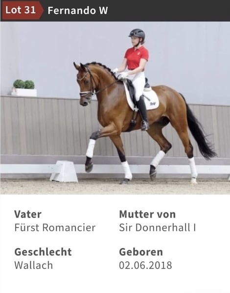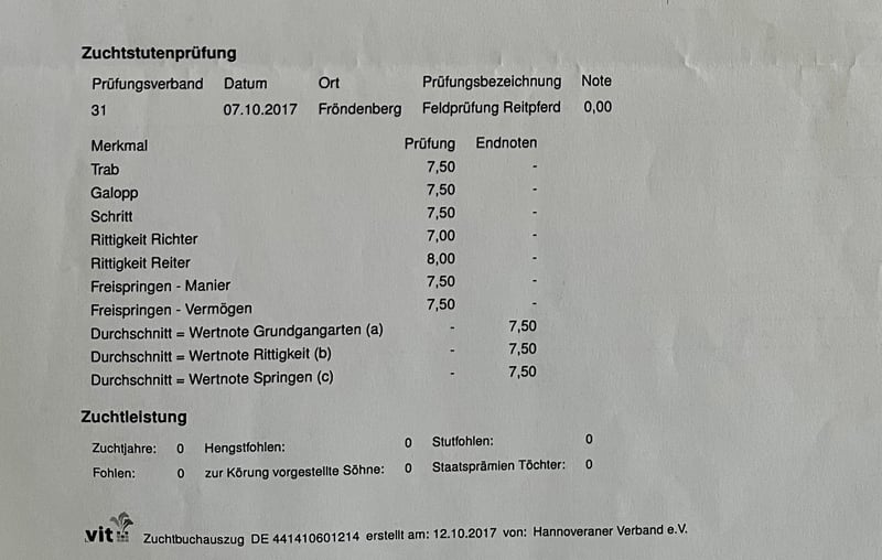 12-jährige Stute von Sir Donnerhall x Ehrentusch tragend von Seacrest Sie ist tragend von Seacrest und wurde das letzte mal am 26.06.2025 gedeckt. Seacrest ist ein Vererber der Station Schockemöhele und stammt ab von Secret x Christ. Die Stute ist ca. 1,70m groß gesund und wurde geritten. Sie war immer gut zu Ihren Fohlen, ist verträglich mit anderen Stuten, schmiede- und verladefromm. Sie hatte bis jetzt vier Fohlen, von denen drei Nachkommen bei uns im Stall stehen und besichtigt werden können. Ihr 1. Nachkomme von Fürst Romancier wurde 2023 anlässlich der Herbstauktion in Münster erfolgreich verkauft. Ihr 2. Nachkomme von Lord Europe ist frisch angeritten . Man kann sagen, dass sie hohe Rittigkeitswerte, Größe und Aktivität vererbt . Ihre Mutter war S-Dressur siegreich und ihr Bruder ist bis Inter I hoch platziert. Eine weiter verwandte Stute wurde Endringstute anlässlich der Elitestutenschau in Münster. Der Stutenstamm überzeugt auch durch einen guten Gesundheitsstatus, röntgenologisch sowie klinisch. Ihr Bruder läuft mit 18 Jahren noch erfolgreich in der Schweren-Klasse. Verkauft wird sie, da wir uns räumlich verändert haben. Nur in gute Hände mit Zuchterfahrung.