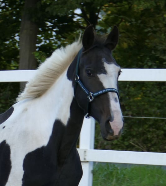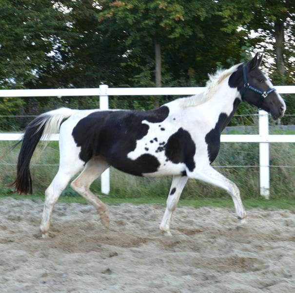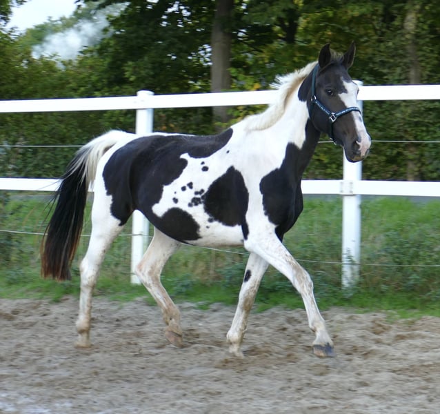 A special offer! Iluminada A - 13-year-old Westphalian mare by Ismo x Shakespeare x Potsdam NRW, height 167 cm. Ilu is homozygous tobiano (so every foal will be spotted), not bred in 2025. She has already produced sport-successful offspring.