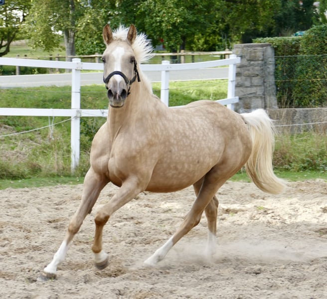 Ismo's Sunrise A - 3 ans, pouliche de rêve en Palomino, taille finale environ 162 cm ! Cette jeune dame, fille de Ismo x Magic Memphis x Rebel Z III, enchante par son charisme et son excellent potentiel de mouvement. Une jument comme peinte, exceptionnellement douée, ouverte à toutes les disciplines équestres ! Ismo réunit une lignée de saut d'obstacles de premier ordre avec Ilasso x First Gotthard x Zeus, sa couleur provient de son père Cremello Magic Memphis, et Rebel Z III est le plein frère de Ratina Z, qui est le cheval de championnat le plus réussi en saut d'obstacles.