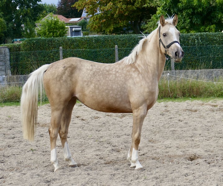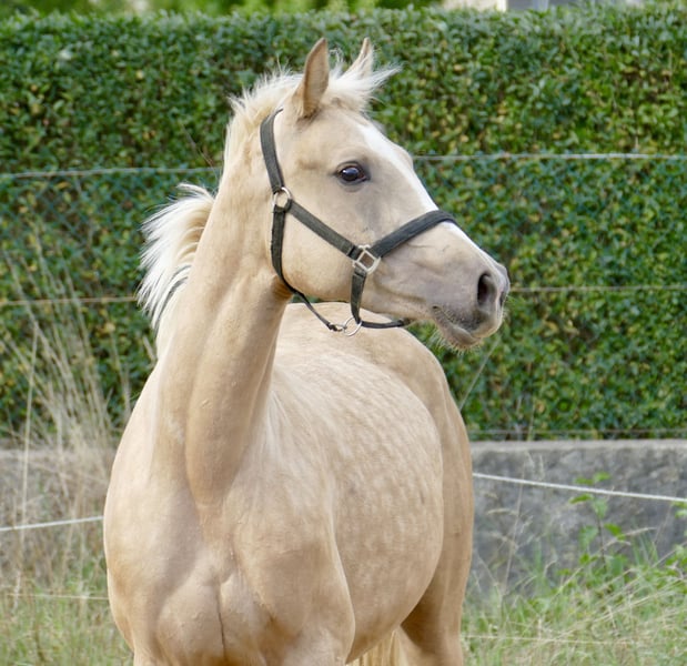Ismo's Sunrise A - 3-year-old dream offspring in Palomino, final height approximately 162cm! This young lady by Ismo x Magic Memphis x Rebel Z III captivates with her charisma and excellent movement potential. A mare that looks like she was painted, outstandingly bred, open to all disciplines of riding! Ismo combines the best jumping lineage from Ilasso x First Gotthard x Zeus, her color comes from the beautiful Cremello Magic Memphis, and Rebel Z III is a full brother to Ratina Z, the most successful championship horse in show jumping.