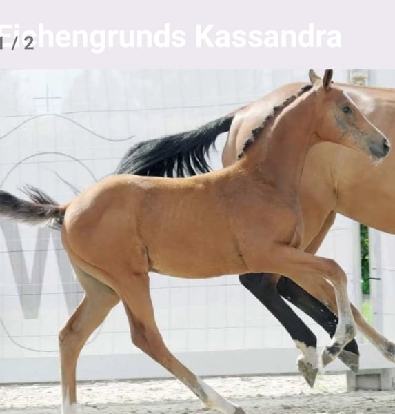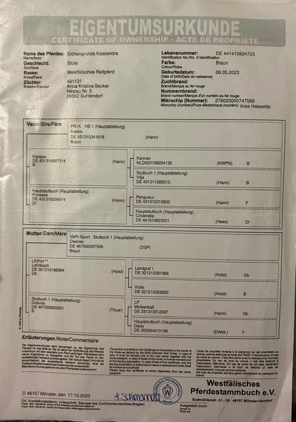 Hier kommt die Chance sich eine der wenigen Töchter des Kataro zu sichern. Diese hochinteressante Nachwuchsstute überzeugt durch Nervenstärke top Exterieur und natürlich in die Wiege gelegtes Springblut. Sorgfältig auf großen Auslaufflächen aufgezogen, überzeugt sie mit bester Gesundheit, menschenfreundlicher zugewandter Art. Das Fohlen ABC, Halfter führig, verladefromm, Hufschmied sicher, sind ihre Talente zur Zeit. Nun ist es an einem Ausbilder aus dem interessanten Rohling ein Sportpferd der Zukunft zu formen.