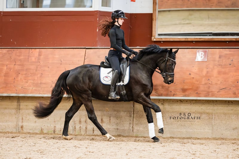 So Perfect, true to her name! A stunning jet-black dressage diva with excellent rideability! So Perfect is a very talented, well-ridden, and movement-rich young horse. She is friendly, approachable, easy to ride, well-behaved, and has very good gaits. With So Perfect, you will acquire a high-quality, absolutely light-footed young dressage prospect with great potential for the sport. Since So Perfect has only been under saddle for a few months and is quite sensitive, she is currently not suitable for beginners or nervous riders. Further training will certainly be rewarding and enjoyable! A recent good health and soundness check, including neck and back, is available. Additionally, So Perfect is ECVM free and currently barefoot.