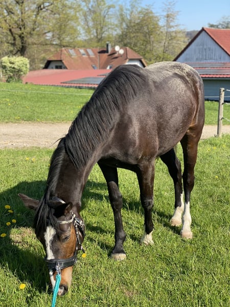 Reitbeteiligung gesucht – junge, talentierte Dressurstute Für meine kleine, junge und qualitätvolle Dressurstute suche ich eine zuverlässige Pflege- und Reitbeteiligung, die Freude daran hat, ein junges Pferd auf seinem weiteren Weg zu begleiten. Die Stute ist frisch eingeritten, dabei aber sehr brav im Umgang und unter dem Sattel. Sie kennt das Gelände und zeigt sich dort unkompliziert. Dennoch ist sie altersbedingt noch ein junges Pferd und braucht daher eine ruhige, erfahrene Unterstützung, die die Basics sicher beherrscht und ihr im Training Sicherheit geben kann. Erfahrung mit jungen Pferden ist wünschenswert – alternativ solltest du dir zutrauen, ein solches Pferd verantwortungsvoll mit auszubilden. Rahmenbedingungen: - Reitmöglichkeiten: Reitplatz & Rundplatz (keine Reithalle – Wetterfestigkeit ist also Voraussetzung 😉) - An deinen Reittagen fallen 1–2 kleinere Stallarbeiten an - In der Anfangszeit wird sie ausschließlich im Unterricht geritten → keine Reitbeteiligungsgebühr während dieser Phase Ich selbst bin Trainerin und reite sie aktuell zweimal pro Woche. Insgesamt kann sie bis zu viermal wöchentlich gearbeitet werden. Langfristig besteht die schöne Möglichkeit, die Stute auf ihrem Weg zu ersten Turnieren und weiterer Ausbildung zu begleiten. Wenn du dich angesprochen fühlst und Lust hast, Teil dieser spannenden Reise zu werden, melde dich sehr gern bei mir. Ich freue mich auf deine Nachricht.