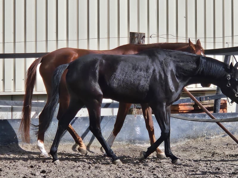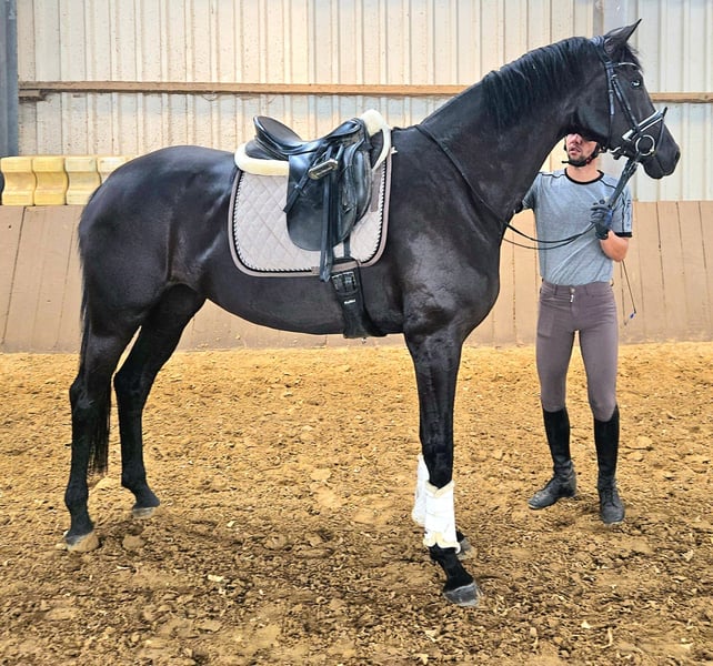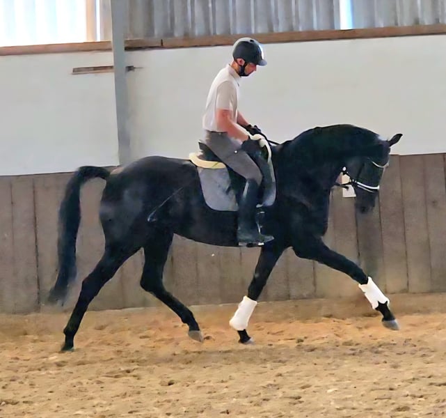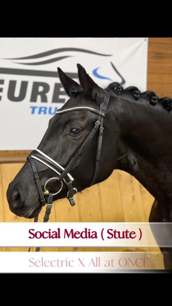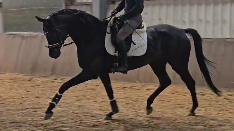 We are offering a beautiful black mare by Selectric. She has enormous movement and is a horse with potential for high-level sport. A mare through and through, she tests and needs a calm, consistent hand. Not suitable for beginners. Raised with love. Due to a finding, she is being sold well below value (more details upon request). Currently, she is turned out with a 4-year-old gelding and is being developed and lightly worked. She should be placed in nurturing, good hands.