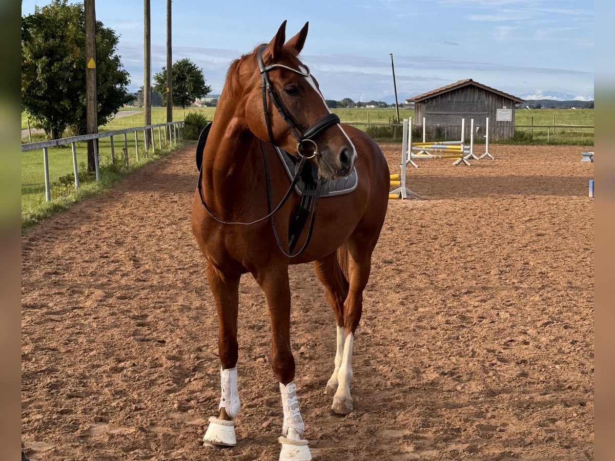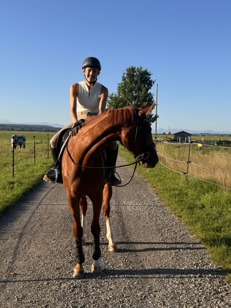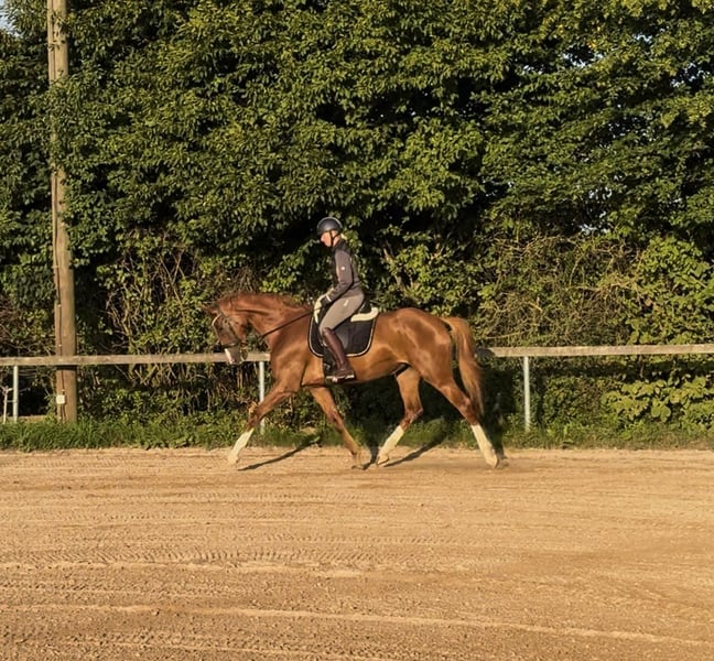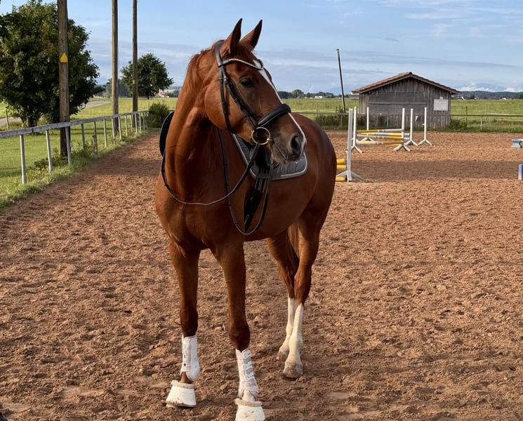 Beautiful dressage mare with heart ❤️, suitable for all disciplines! I am looking for a loving home for my stunning 5-year-old chestnut mare. She currently measures 16.1 hh. ❤️ Above-average basic gaits with great potential for future work in the arena, excellent hindquarter activity, well-ridden and easy to keep in contact ❤️ Talent and courage over fences! She has been trained and versatilely promoted by an eventing rider so far. Dressage: Basic level of dressage training (A level) Jumping: Can already do small E-level courses, but also jumps individual higher fences Well-behaved in the indoor arena, on the training ground, and in a group, including in the field. Recent X-rays of her back are excellent. She loads calmly, is very well-mannered with the farrier, and is a very affectionate and cuddly horse. She has been with me since her foal year and has not experienced any negative situations in her life. She was gently backed because she is quite tall. A horse that is eager for all adventures, she wants to go out and get started! However, she needs a rider with courage and confidence to build trust. She feels uncomfortable with nervous riders, so she is not suitable as a beginner's horse.