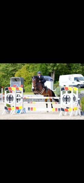 Arnton is a 10-year-old show jumping gelding by All Music, out of a Laurentianer mare. He is a talented sport horse with a strong drive in the arena and a consistent track record of success. In the most recent competition season, Arnton achieved 22 wins in jumping classes at the L and M levels (110–125 cm). He was personally ridden, trained, and introduced to competitions by me as an amateur rider. In the jumping phase, Arnton demonstrates motivation, caution, and a lot of overview. He also impresses in daily handling with his impeccable character: absolutely gentle, farrier- and loading-friendly. An honest and successful show jumper with competition experience.