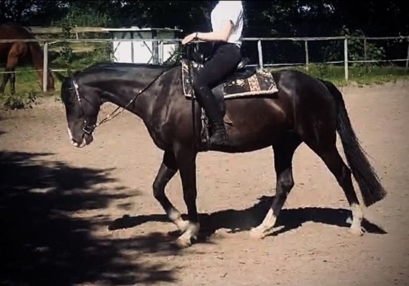Zum Verkauf steht aufgrund persönlicher Umstände, ein beeindruckender unverbrauchter Westfalen Wallach, geboren am 03.05.2014 - Angeritten im Spätsommer 2018 (+ 3/4Jahr Weide). Dieser prachtvolle Rappe besticht Optisch klar durch seine elegante Erscheinung und seine beeindruckenden Gänge. (Ein !Stallgebundenes! zur Verfügung stellen gegen Kostenübernahme wäre eventuell auch denkbar.) Er ist ein talentierter Dressurspezialist und mit seiner beeindruckenden Präsenz und seinem ausgezeichneten Bewegungsablauf, ist er der perfekte Partner für ambitionierte Dressurreiter mit genügend Potential um im ganz großen Viereck, genau wie seine Vorväter glänzen zu können. Auch im Parcours macht er eine super Figur und nimmt einen butterweich mit auf die andere Seite. Gesprungen wurde er erstmalig in seinem 8. Lebensjahr. Wodurch seine Beine, um es mit den Worten des Tierarztes, welcher kürzlich seine AKU durchführte zu sagen, super in Schuss, mit keinerlei Auffälligkeiten oder Schäden dasteht. Dem Tierarzt fehlten die Worte nach dem er die Beine in Form von Beugeproben getriggert hat, sich nichts am Gangwerk verändert hat. Er war begeistert von der Gesundheit dieses Pferdes. Beim Freispringen springt er ganz entspannt die Obergrenze eines M** Parcours von 1,40/45 m. Auch dort ist aber noch Potential für einiges mehr. Unterm Reiter wurde er aufgrund persönlicher Umstände bisher nur vereinzelte L- M*Sprünge, bzw. Mini Parcoure gesprungen, was er aber auch sehr gut gemeistert hat. Sein Charakter ist ebenso bemerkenswert wie sein Aussehen. Er ist ein absoluter Gentleman, sehr schmusig, immer bereit, sein Bestes zu geben und seine Reiter zu beeindrucken. (Mit einem sicherheitvermitelndem Reiter der weis was er tut und tun möchte, ist er wahrlich ein überaus zuverlässiger Partner in allen Spaten und Klassen der Reiterei.) Dieser Wallach ist nicht nur ein talentiertes Dressurpferd, sondern auch ein treuer Freund. Er liebt es Zeit mit Menschen zu verbringen und bald hoffentlich auch zu einem festen Bestandteil Ihrer Familie werden zu dürfen. Wenn Sie auf der Suche nach einem Pferd sind, mit dem sie weit kommen können, das Sie in der Dressur auf das nächste Level bringen, mit dem sie sanft über Hindernisse fliegen und entspannt im Gelände die Seele baumeln lassen können und gemeinsam „Alt“ werden möchten, dann ist dieser Herzensbrecher genau das Richtige für Sie. Mit seinen 1.66m Stockmaß deckt er, trotz seiner schönen sportlichen Figur, auch größer gewachsene Reiter (Ich als Reiterin auf den Bildern bin 1.83m groß ) selbst im Dressursattel bei längeren Bügeln sehr gut ab. Ein gewichtsträger ist er aber natürlich dennoch nicht. Auch wenn er vereinzelt durch sein kompaktes Gebäude sicher ab und an mehr tragen könnte. Dies würde ich mir für ihn jedoch nicht wünschen. Bitte zögern Sie nicht, uns für weitere Informationen zu kontaktieren. Wir freuen uns wenn wir sie und diesen außergewöhnlichen Wallach zusammenbringen können. Er hat nur das aller beste verdient und nichts geringeres kommt für uns, bzw. ihn in frage. Hinweis: Besichtigungen und Proberitte sind nur nach vorheriger Terminabsprache möglich. Zum Wohle des Tieres und um Reittourismuss zu verhindern, erheben wir fürs probereiten/ vorreiten lassen eine angemessene Gebühr, welche bei Kauf natürlich angerechnet wird. Wir freuen uns auf eure Zuschriften und ein hoffentlich auf ihn zugeschnittenes neues Frau-/Herrchen mit einem hoffentlich tollem für immer Zuhause. Mit freundlichen Grüßen, Eileen & S.C.