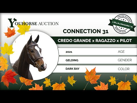 Der vierjährige Connection 31 ist ein gutaussehender, leichtfüßiger Wallach, an dem Sie Freude haben werden. Er zeigte beim Springen Sorgfalt und Vorsicht. Zwei Halbbrüder sind bereits sehr erfolgreich im Sport: MTM Los Angeles (1,60 m GP mit Brian Moggre, jetzt 1,55 m GP mit Antonia Vita Pinardi) und MTM Peanut (1,45 m Niveau mit Tracy Fenney). Vater Credo Grande ist ein achtjähriger Westfale mit Prädikat, auf 1,30 m Niveau. Sein Halbbruder Tyson 33 sprang 1,60 m Grand Prix mit Tim Hoster. Mutter Radunar (Ragazzo x Pilot) sprang selbst 1,40 m. Aus dieser Familie stammt auch Message for You (1,50 m).