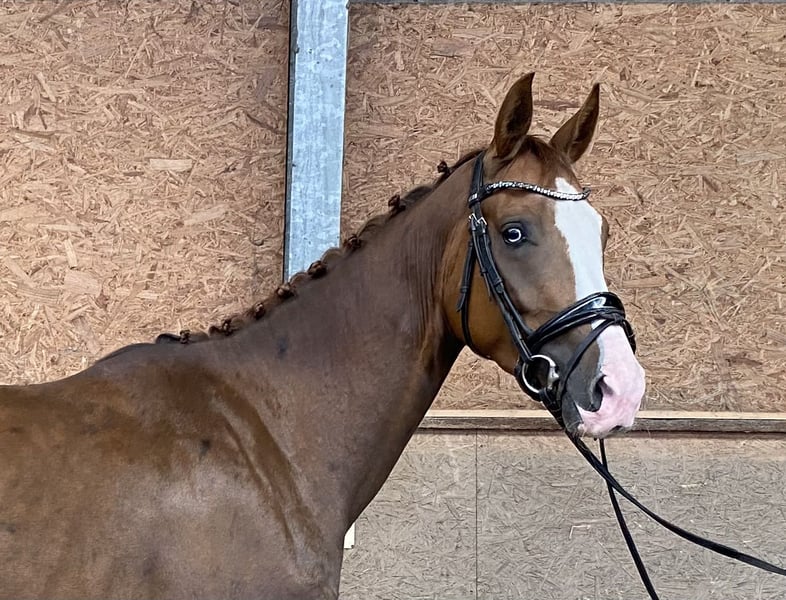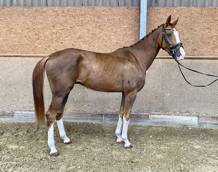 **Sales Advertisement: Dream Dressage Horse for Sale** For sale is a beautiful Westphalian gelding, born in 2022. With an impressive height of 170 cm and his elegant dark chestnut color, he catches everyone's eye. His two blue eyes and four white socks are particularly striking. This talented gelding is perfectly suited for dressage and already shows promising potential in his training. At the moment, he is being lunged in accordance with his age, and the price will increase with further training. He impresses with his quality of movement and his friendly character, making him an ideal partner for ambitious riders. He is well-mannered, easy to handle, and has a pleasant temperament. Whether for competition or as a leisure horse – this Westphalian offers numerous possibilities. If you are interested or would like more information, please feel free to contact me. Don't miss this opportunity!