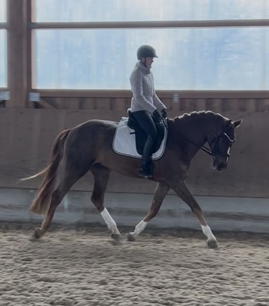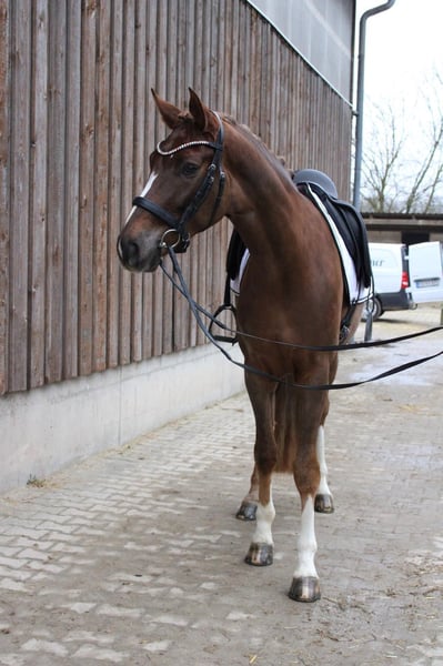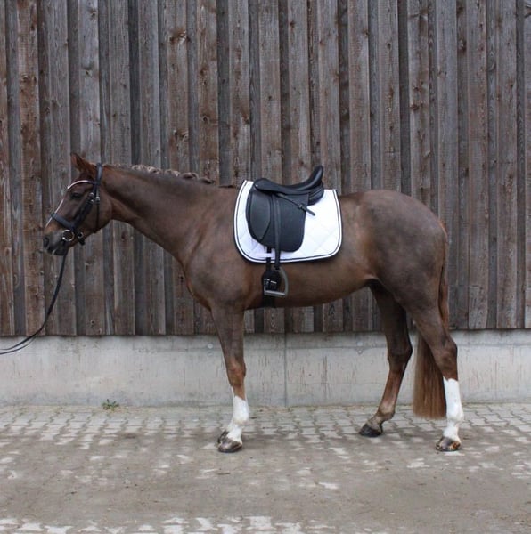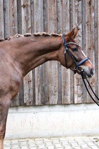 Zum Verkauf steht ein vierjähriger Dunkelfuchs aus westfälischer Zucht, abstammend von Bacardi’s Best x Fürst Romancier. Er ist ca 1,72 groß Mokka verfügt über drei sehr gute Grundgangarten, besonders hervorzuheben ist sein schwungvoller, taktsicherer Trab mit viel Elastizität. Er wurde im letzten Jahr schonend angeritten und anschließend bereits in zwei Reitpferdeprüfungen mit guten WN vorgestellt. Nach einem bewusst ruhigeren Winterprogramm wird er aktuell wieder altersgerecht und kontinuierlich gearbeitet. Charakterlich ist er absolut überragend: • sehr brav beim Reiten und im täglichen Umgang • äußerst menschenbezogen, liebt Kuscheleinheiten • auf Turnier extrem gelassen und unkompliziert • verlade- und schmiedefromm • komplett schrecklos, auch bei Traktoren, landwirtschaftlichen Maschinen und sonstigen Umweltreizen Im Sommer war er regelmäßig ausreiten und spazieren, was er stets entspannt und souverän gemeistert hat. Röntgenbilder liegen ohne Befund vor. Ein toller junger Dressurnachwuchs mit bestem Charakter, ideal für Sport und ambitionierte Reiter, die ein ehrliches, nervenstarkes Pferd suchen. Platz vor Preis Für das Probereiten wird eine Pauschale von 30 € erhoben, da wir keinen Reittourismus unterstützen.