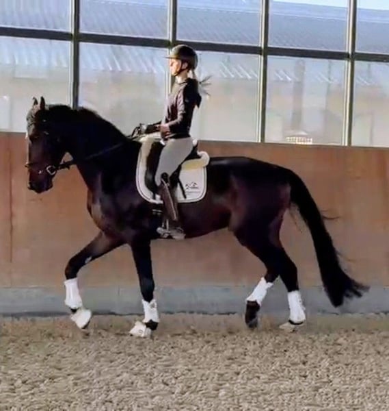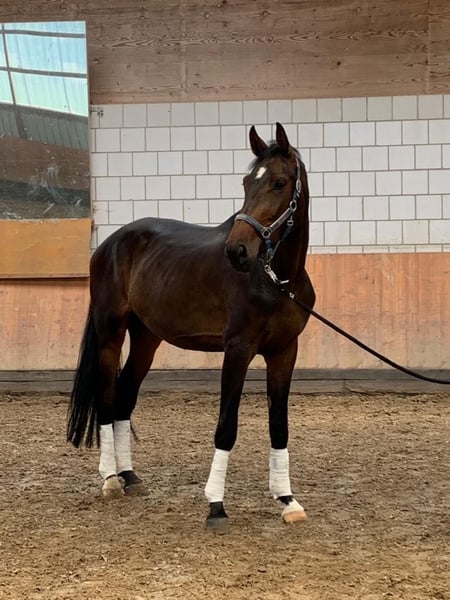 Five-year-old gelding by First Deal (Floriscount x De Niro) out of a Ferragamo mare, boasting excellent basic gaits, good rideability, and a lovely temperament! Thanks to his high willingness to learn and enjoyment of dressage work, he has the potential for higher-level tasks with proper training, presenting a superb frame. He is also suitable for riders who have not yet achieved success in the higher dressage classes, as he is eager to learn the next movements playfully under appropriate guidance. Currently, he is also ridden by our 12-year-old children. He could also be considered as a potential vaulting horse. His half-brother "Alvin A" (Apollon x Ferragamo) was successfully competed from the age of 5, placing highly from Dressage Horse A up to Dressage Horse M. He has since advanced to the S-class and has competed internationally. His dam has also been presented in dressage up to medium level. X-rays, including the back, are available and show no abnormalities. Feel free to contact us at 0172-5200847 or 0172-5258330.