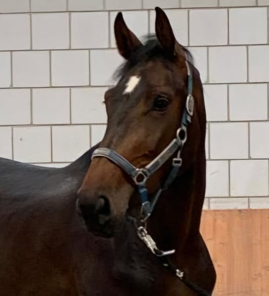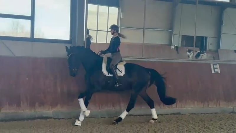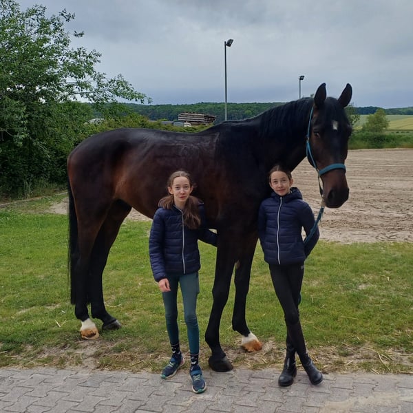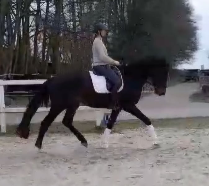 Hongre de 5 ans par First Deal (Floriscount x De Niro), issu d'une mère Ferragamo, doté d'excellentes allures de base, d'une grande facilité de dressage et d’un tempérament agréable ! Grâce à sa grande envie d'apprendre et à son plaisir dans le travail de dressage, il peut, avec un encadrement approprié, devenir un candidat pour des tâches plus élevées, avec une belle silhouette latérale. Il convient également aux cavaliers qui n'ont pas encore obtenu de succès dans les hautes classes de dressage, car il souhaite apprendre de manière ludique les prochaines figures sous une guidance adaptée. Actuellement, il est également monté par nos enfants de 12 ans, qui s'entraînent avec lui pour le niveau de dressage L. Il serait également envisageable comme cheval de voltige. Son demi-frère "Alvin A" (Apollon x Ferragamo) a été, dès ses 5 ans, très bien classé lors de ses débuts en compétition, allant de Dressurpferde A à Dressurpferde M. Il est maintenant déjà en classe S et a notamment participé à des compétitions internationales. Sa mère a également été présentée en dressage jusqu'à la catégorie intermédiaire avancée. Les radiographies, y compris du dos, sont disponibles et sans anomalie. N'hésitez pas à me contacter au 0172-5200847 ou 0172-5258330.