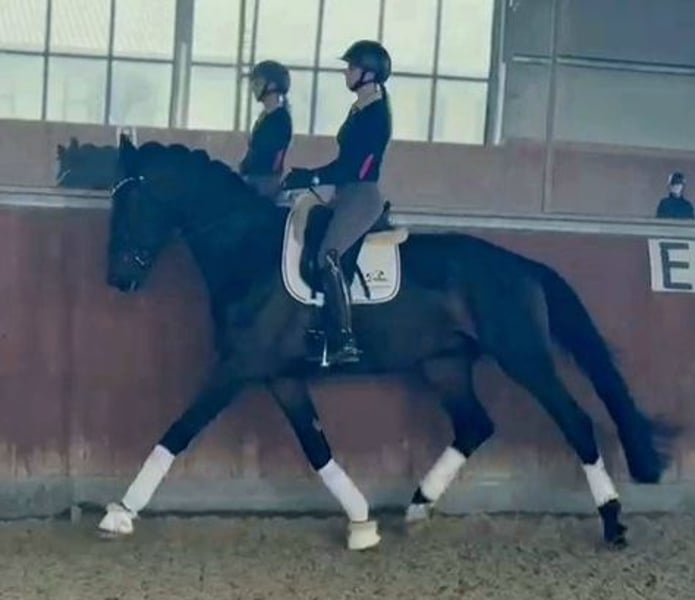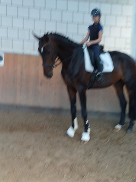 5-jähriger Wallach von First Deal (Floriscount x De Niro) aus einer Ferragamo Mutter mit hervorragenden Grundgangarten, Rittigkeit und einem tollen Interieur! Durch seine hohe Lernbereitschaft und Freude an der Dressurarbeit ist er bei entsprechender Förderung ein Kandidat für höhere Aufgaben mit einem super Seitenbild. Auch für Reiter, die für sich noch keine Erfolge in den hohen Dressurklassen erreicht haben geeignet, da er unter entsprechender Anleitung spielerisch die nächsten Lektionen lernen möchte. Zur Zeit wird er auch von unseren 12-jährigen Kindern geritten, die mit ihm für die Dressurreiter-L jetzt trainieren. Auch als Voltigier-Pferd denkbar. Sein Halbbruder "Alvin A" (Apollon x Ferragamo) konnte sich als 5-jähriger von Beginn seiner Turnierkarriere von der Dressurpferde A bis zur Dressurpferde M hoch platzieren. Inzwischen ist er bereits in der S-Klasse angekommen und war unter anderem bereits international unterwegs. Auch seine Mutter wurde in der Dressur bis zur mittelschweren Klasse vorgestellt. Röntgenbilder incl. Rücken liegen vor und sind ohne Befund. Kontakt gerne unter 0172-5200847 oder 0172-5258330