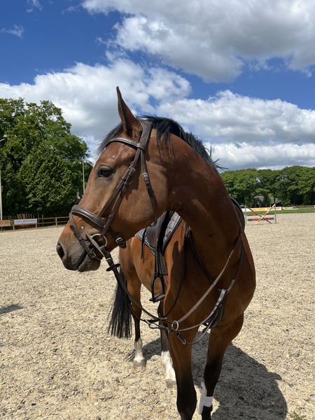 Cavallo di 5 anni, proveniente da ruin Columbus Z x Cornet's Stren x Contini Altezza: 167 cm Da marzo sotto la sella e di mia proprietà, ancora nessun passo falso. Partecipa regolarmente alle lezioni in club ed è stato portato alcune volte a saltare percorsi, a fare uscite a ritmo libero (da solo e in gruppo) e a frequentare terreni di cross, che affronta molto bene. È un cavallo dal carattere naturalmente coraggioso e calmo, con buona motilità e entusiasmo durante la monta. Facile da gestire e vive in un branco misto al pascolo. Non ha ancora esperienza in competizione a causa di mancanza di tempo del cavaliere, ma anche dopo una settimana di inattività, si può partire senza problemi. Esame clinico e radiografie dell'anca con lievi riserve (controllato da veterinario FEI senza problemi per lo sport, eventuale intervento chirurgico possibile). Per ulteriori informazioni, scrivere WhatsApp al 0630093780; si prega di non chiamare per via di orari di lavoro variabili.
