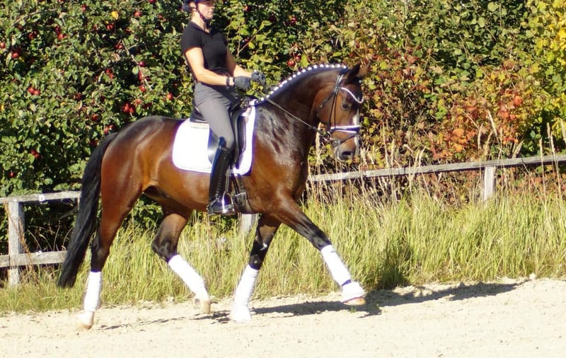 Dinero, malgré les grandes traces laissées par ses proches, n’a pas besoin d’un grand spectacle pour impressionner. Lors de sa première épreuve de dressage pour jeunes chevaux, il a remporté la victoire avec une grande assurance, répondant ainsi immédiatement à des attentes très élevées. Le gagnant de la série S, Dancier Gold, ainsi que ses trois frères et sœurs complets, également performants en classe S, prédisposent ce charmant cheval, plein de caractère, à atteindre les plus hauts niveaux. Sur le plan du tempérament, il est clairement influencé par Dancier Gold. Son attitude douce, son comportement réservé et sa constante volonté de performer sont typiques de son père et de son fils. Sa mère, la gagnante de concours de chevaux de selle, Fire and Ice, lui transmet puissance, souplesse et légèreté. En plus, il hérite de ses deux parents un excellent sens de l’équilibre et une bonne mâchoire. Dans l’ensemble, il représente le cheval de dressage parfait, qui se déplace avec aisance et sans aucune tension artificielle, comme une plume.