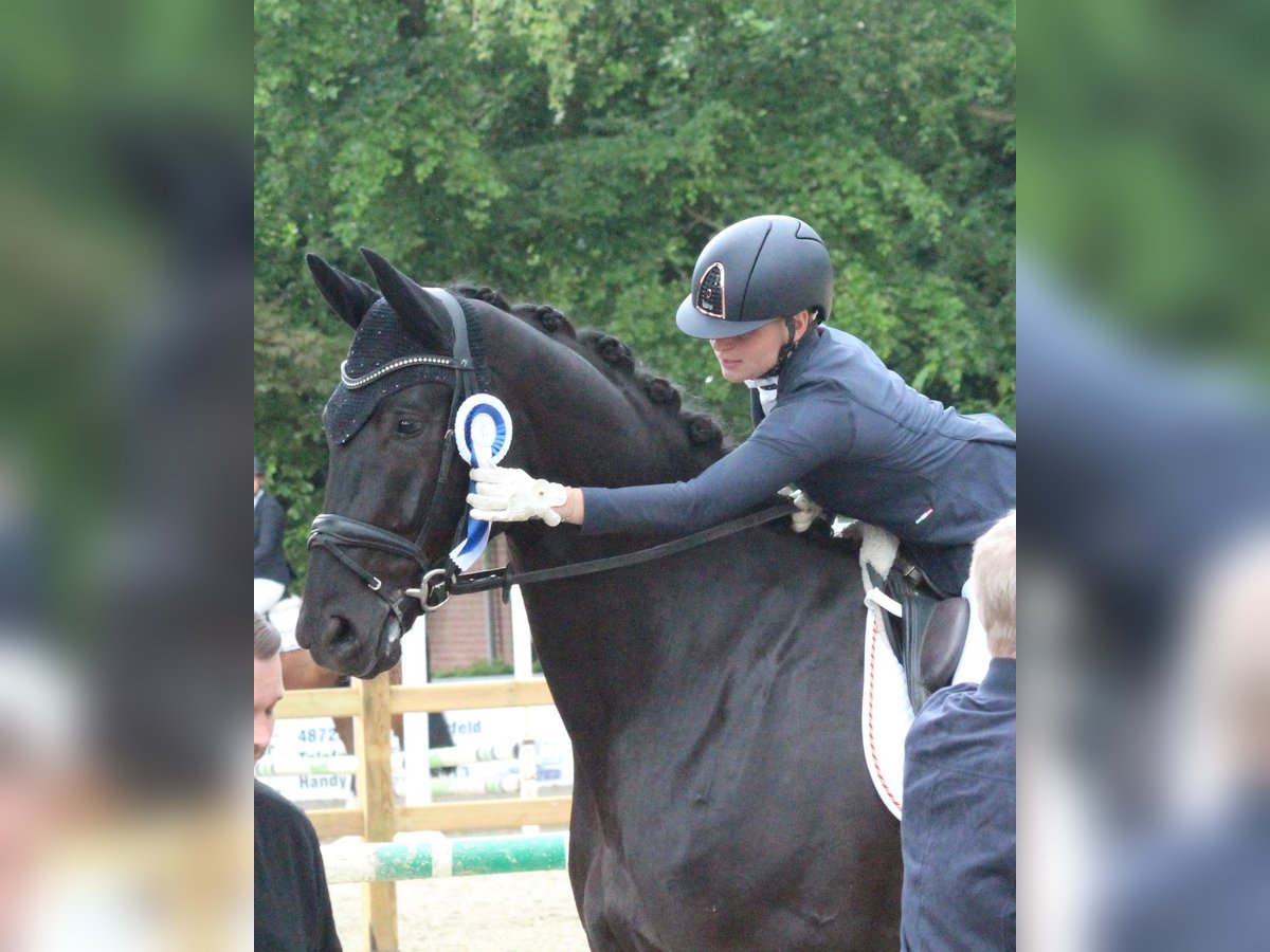 Scottish Peat – a jet-black giant with a heart of gold Scotty is an impressive, large-framed gelding with genuine presence – a horse that quickly captures your heart. Despite his XXL size, he is very sensitive to riding aids, easy to handle, and always fair in his dealings. He comes directly from the breeder and is a son of the Hanoverian dressage champion Spökenkieker, from a highly successful dam line. A recent X-ray examination is available, and he has a clean radiological report, including a discount due to vocal cord correction. Sportingly, Scotty has already proven himself: multiple high placements in young horse classes and A-level dressage competitions. Currently, he is in L-level training and already knows extended trot, simple changes, and short turns – always motivated, honest, and eager to learn. Scotty loves variety: hacking (absolutely trail-safe), pole work, jumping, free jumping, ground work, or simply cuddling – he’s up for any activity and always enthusiastic. His gentle, loving nature makes him a very special partner who strives to please his rider. An extraordinary, jet-black dressage prospect with a lot of heart, quality, and potential – ideal for riders seeking a large horse with a big character.