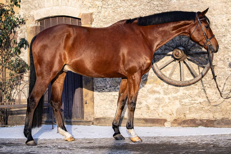 Durch sein Erscheinungsbild und seine freundliche Art fällt er schon beim Betreten der Stallgasse auf. Im Umgang unkompliziert und mit anderen Pferden absolut verträglich beweist er sein soziales Wesen. Sportlich gesehen hatte er einen Paradestart in das Turnierleben und seine Qualifikation für das Bundeschampionat mit Noten von bis zu über 9,0 erhalten. Nach der erfolgreichen Saison ist er dann in Amateurhand gekommen und wurde als Allrounder eingesetzt. Hier wurde klar, dass der schnelle Einstieg in das Turnierleben und erhöhte Trainingsbedingungen Herausforderungen hinterlassen hatten und ihm zuweilen das Vertrauen in sich und den Reiter fehlt. So fehlt ihm bei der Bewältigung von Aufgaben häufig Mut und Neugier, die der Reiter ihm vermitteln muss. Findet er Vertrauen, dann ist er ein toller Sportler und kann sich sicher zukünftig auch im internationalen Bereich etablieren. Nach etwas vertrauensvoller Arbeit und Training kann es diese Saison wieder ins Turniergeschehen gehen und Schleifen gesammelt werden. Wir freuen uns diesem tollen Nachwuchspferd ein passendes Zuhause zu suchen. Bei ernsthaftem Interesse, schreiben Sie uns gerne eine WhatsApp.